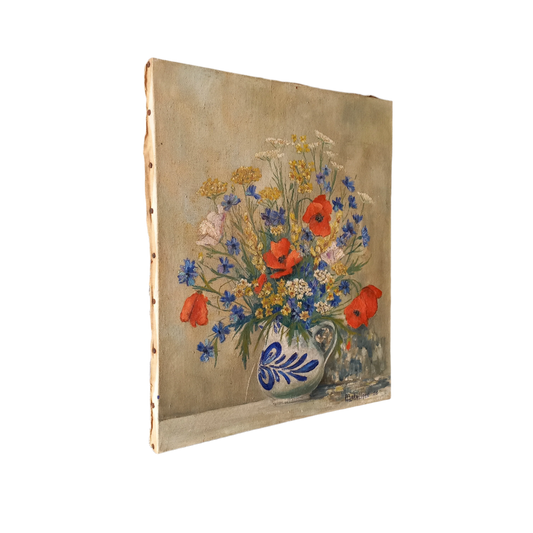 Large vintage floral still life oil painting on stretched canvas from France, painting of bright and colorful flowers, floral art