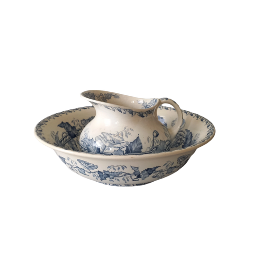 French antique ironstone pitcher and bowl wash set with blue floral pattern, Sarreguemines jug and bowl