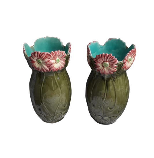 Pair of French vintage majolica vases, decorative vases, country home decor