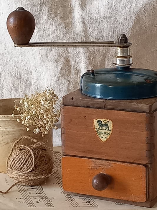 Vintage Wooden Coffee Grinder With Blue Detailing by Peugeot