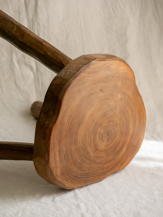 French vintage wooden stool with three turned wooden legs