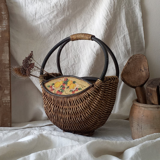 French Vintage Wicker Shopping Basket with Hand Painted Decoration