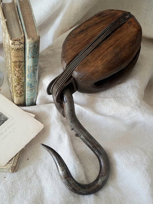 French Antique Aged Wooden Boat Pulley Block and Metal Hook, Rustic Nautical Decor