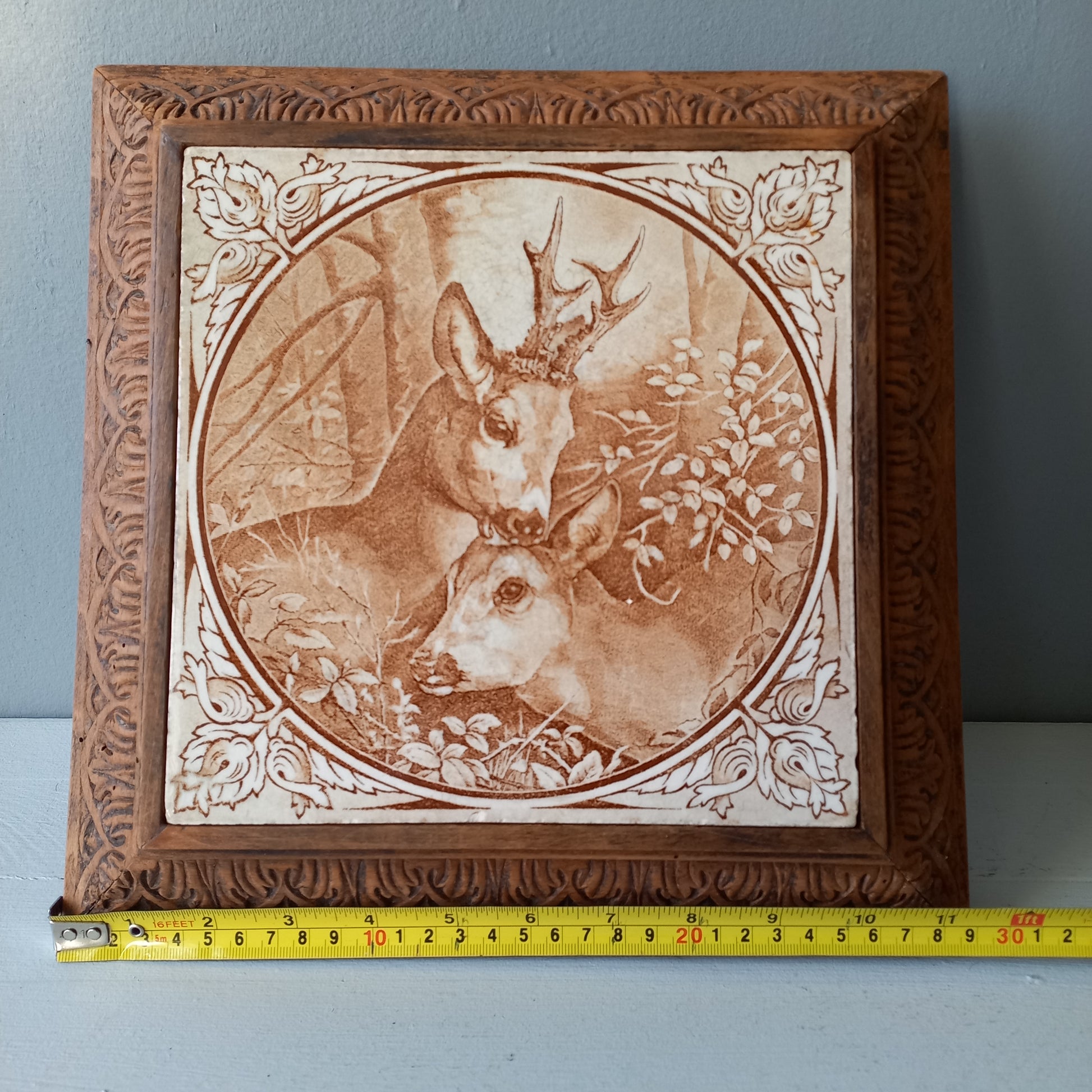Large antique deer tile trivet in a carved decorative wooden frame - a heavy and quality piece. The ceramic tile is made from either ironstone or earthenware and depicts a doe and fawn in a warm sepia shade - the tile is set inside a beautiful carved wooden frame. Being an antique piece there are a few areas to note so please see condition and dimension details listed below.