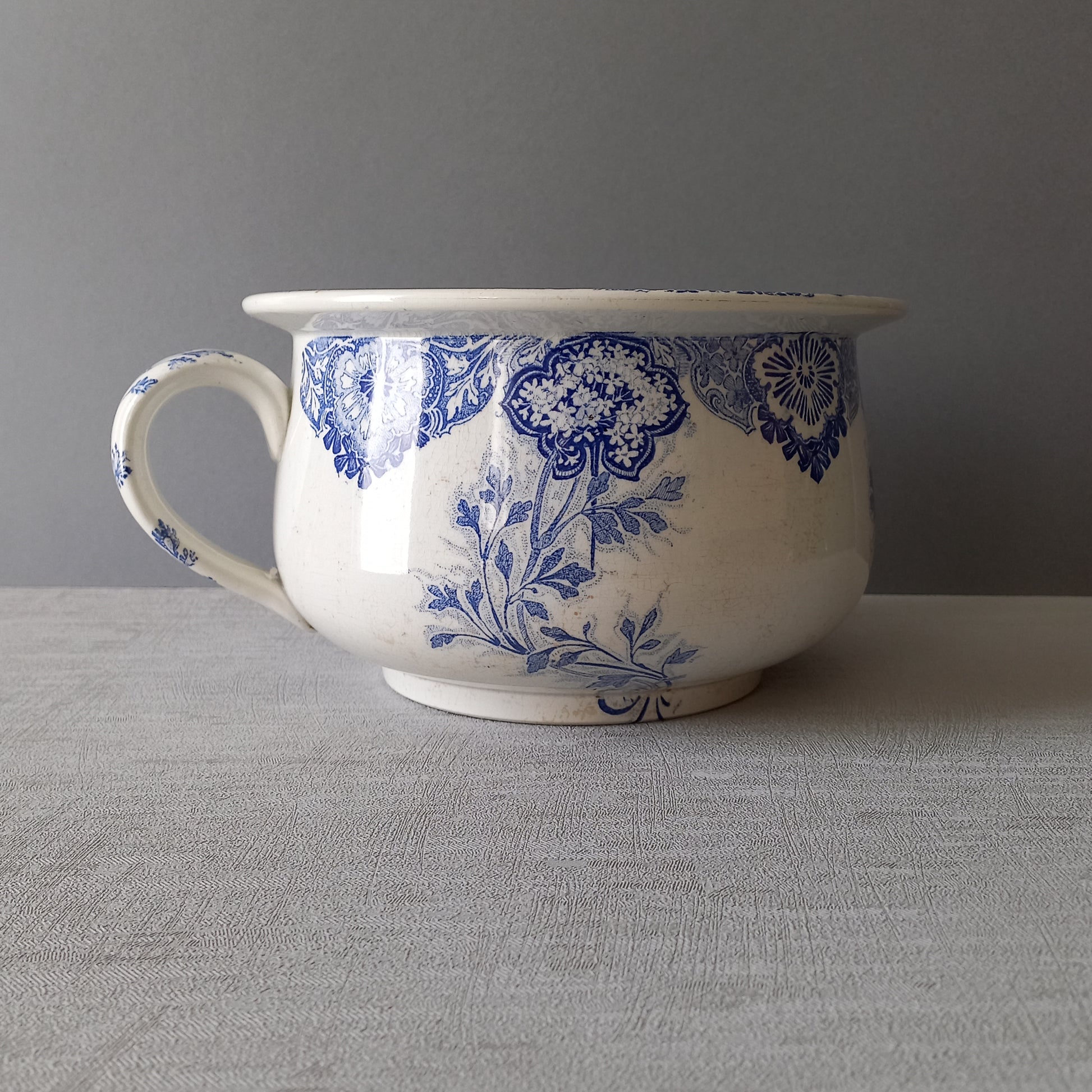 A stunning French antique ironstone chamber pot in white with blue floral transferware pattern. The maker's mark underneath tells us it was manufactured by Luneville in circa. 1879. These days this wonderful piece will make interesting stand-alone decor or a great plant pot holder. Being around 145 years old there are of course signs of age so please see dimensions and read item's condition details listed below.