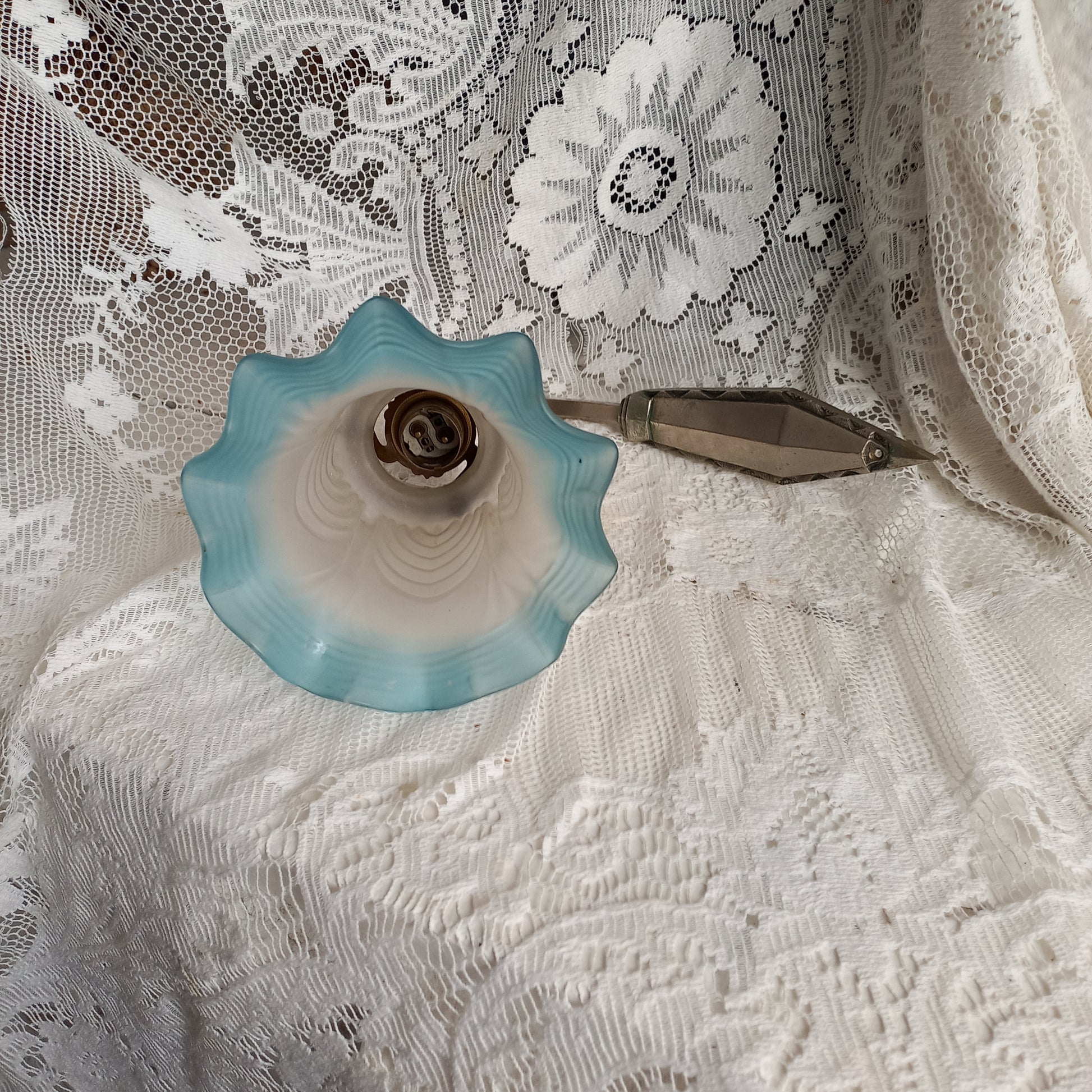 Antique wall light with white and blue tulip frosted glass lampshade