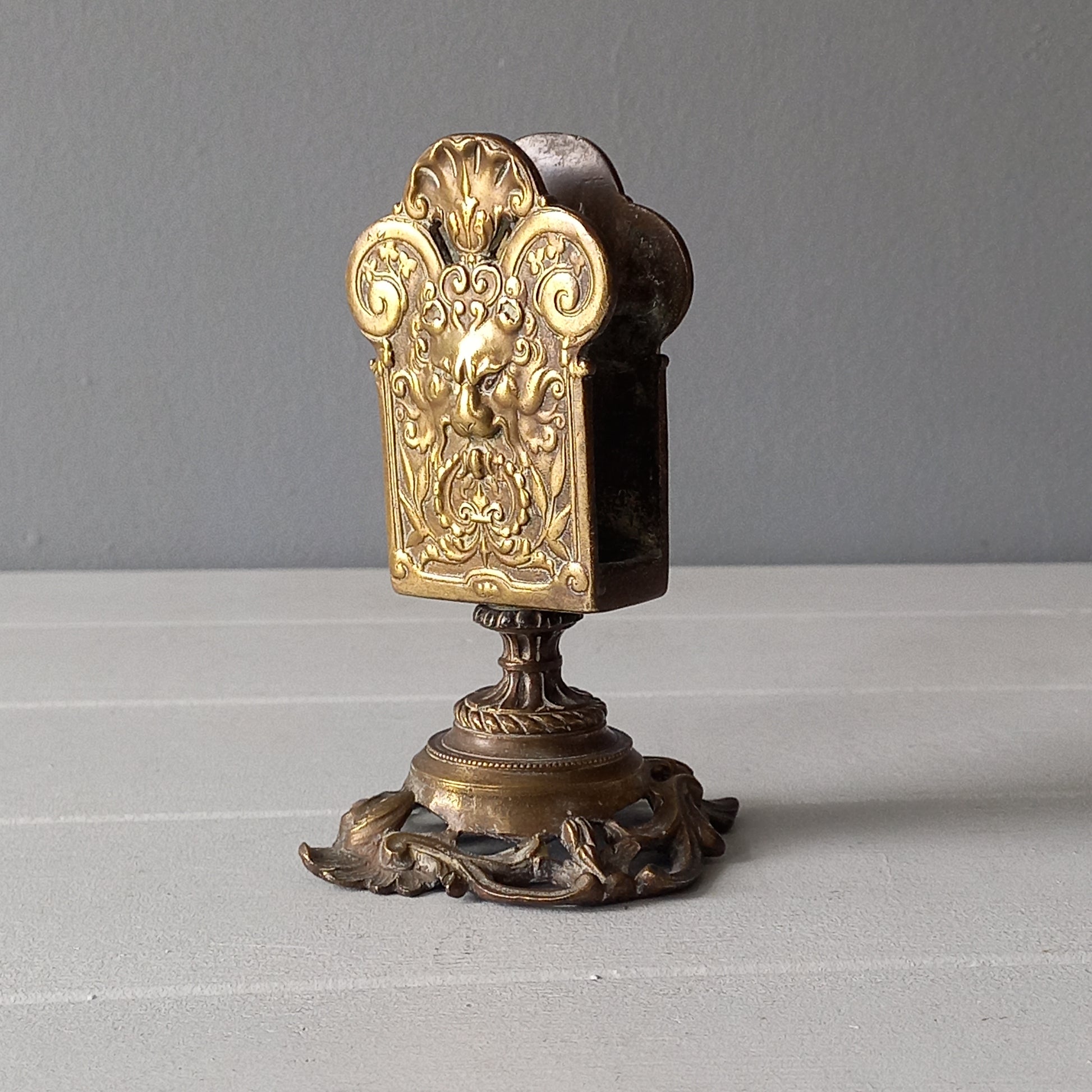 A small antique brass/bronze matchbox holder from France, a highly decorative piece that is surprisingly heavy for its size. This quality piece of French history makes great desk, table, or shelve decor. Note: remember that when this was made matchboxes were smaller.