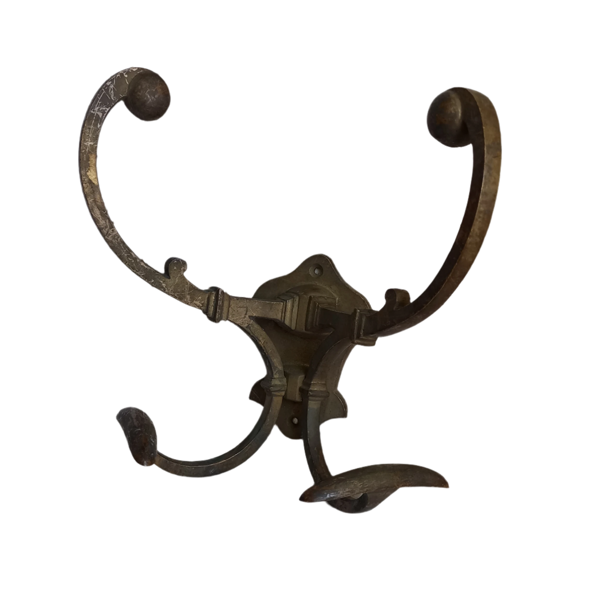 An antique double coat and hat hook made from a heavy gauge metal. This wonderful authentic French coat and hat hanger has real character, and having been used over many decades has age-related wear; the finish is dull with scratches and lots of signs of wear in areas. Please see dimensions and condition details listed below.
