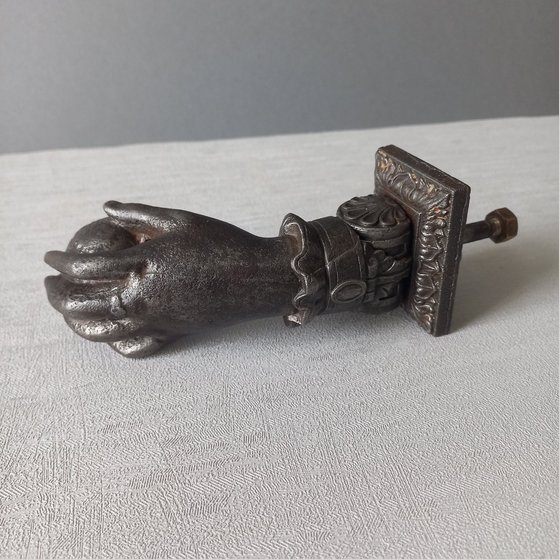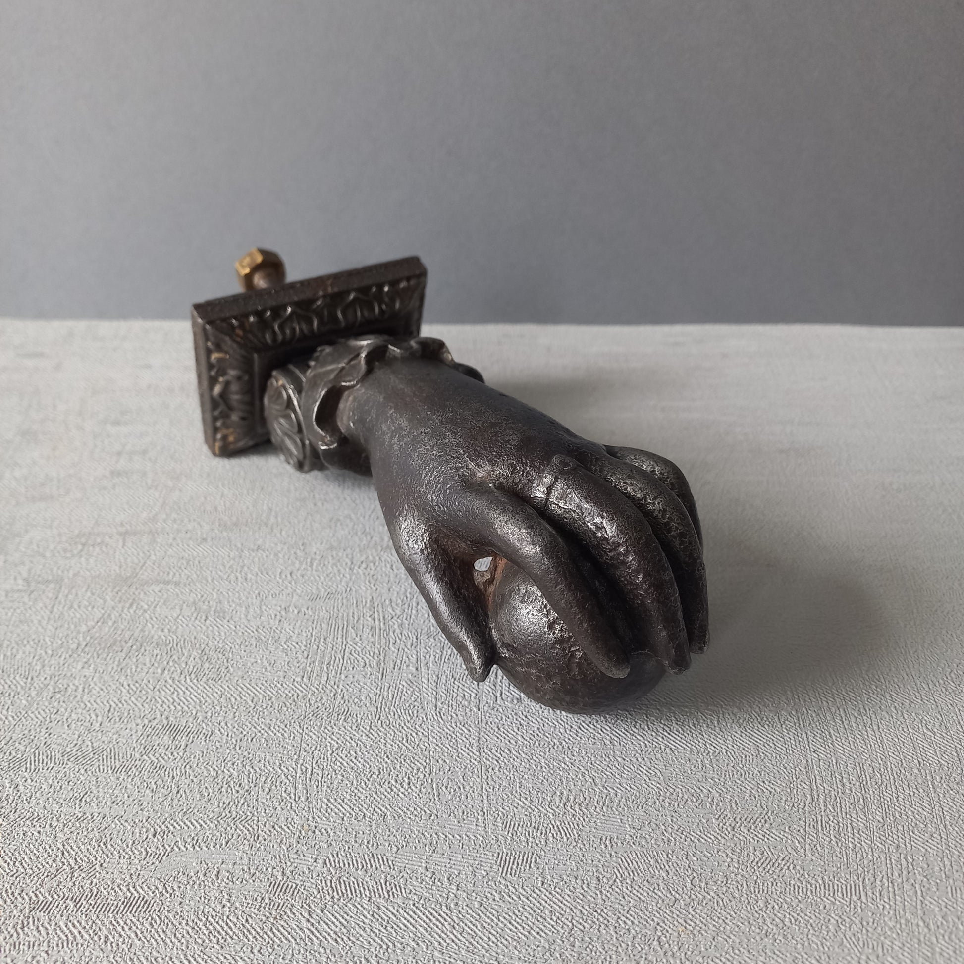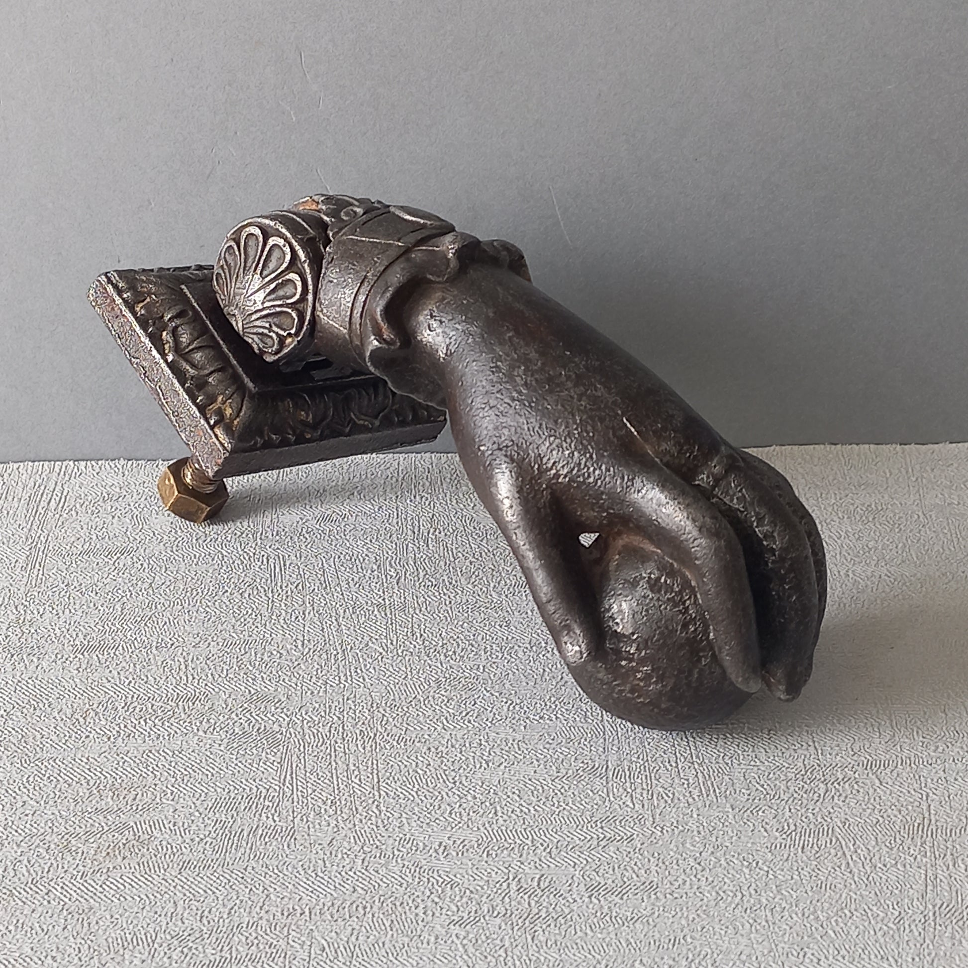A French antique female hand cast-iron door knocker, an original decorative piece of door decor which is a quality, solid piece.
