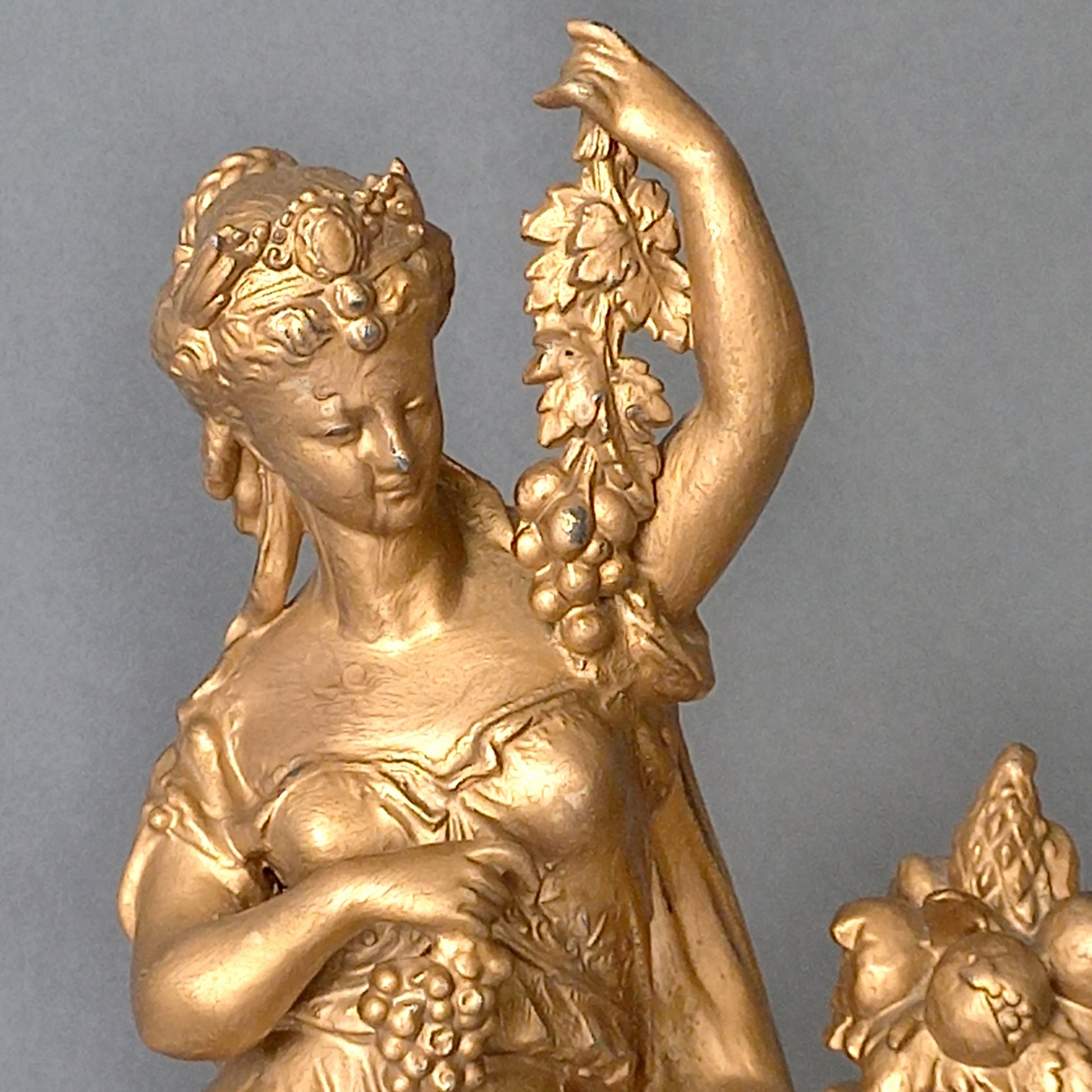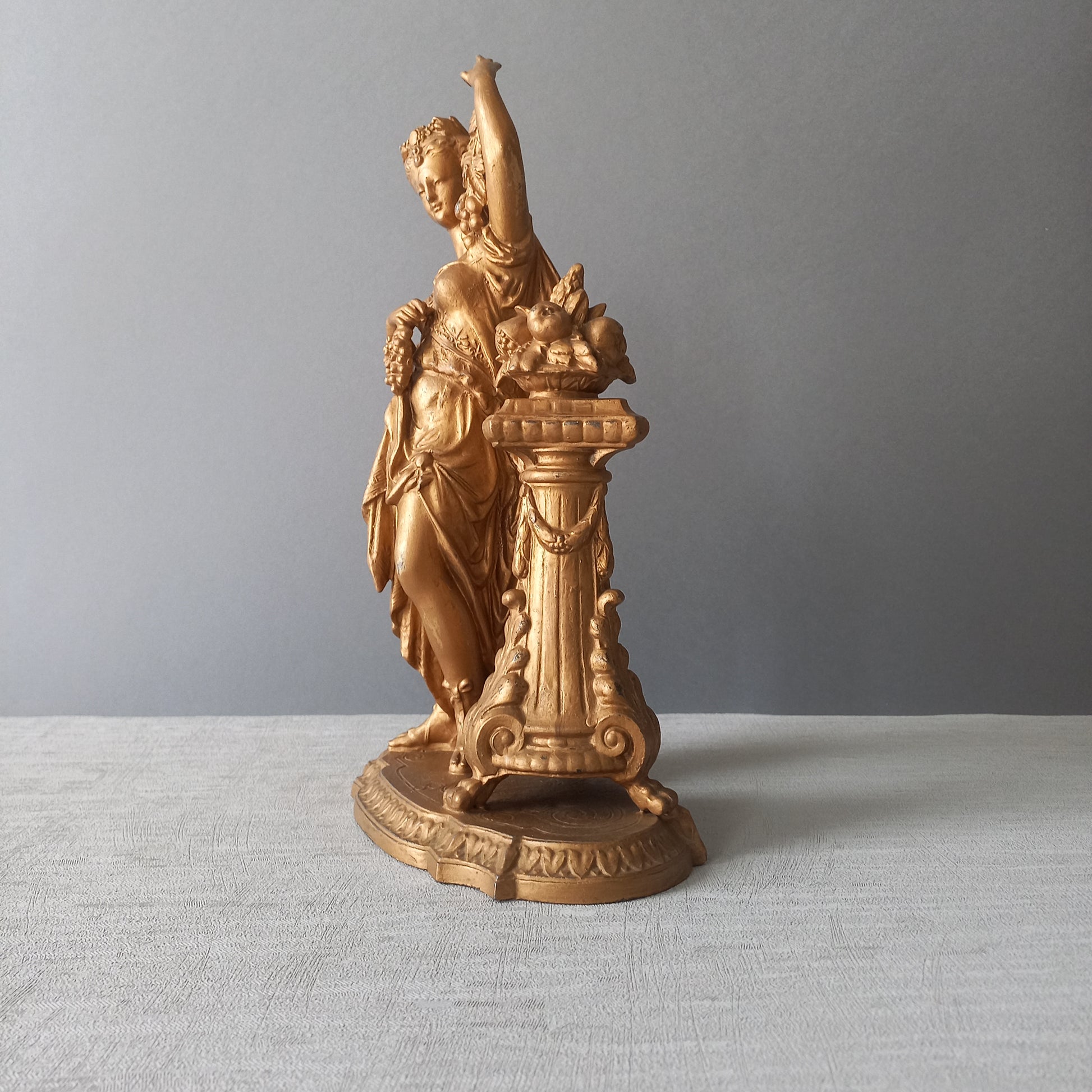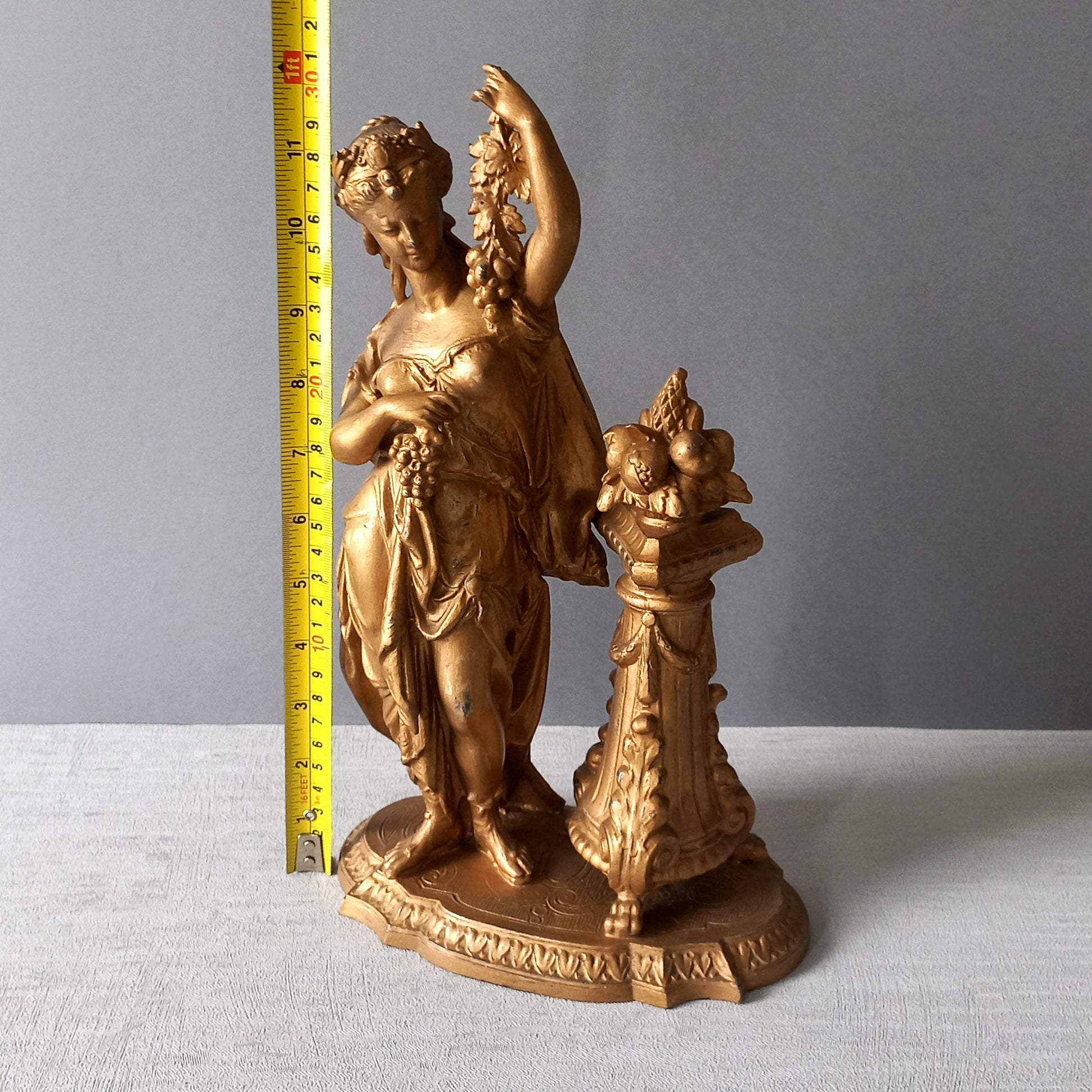Large French antique female statuette/figurine in the style of classical Greek/Roman art - cast in a heavy metal and finished in a gold/bronze colour, it really looks very special. It's a wonderful old statuette that is just the right size to make a real statement as an interior decorator's piece, not to mention a wonderful work of art.