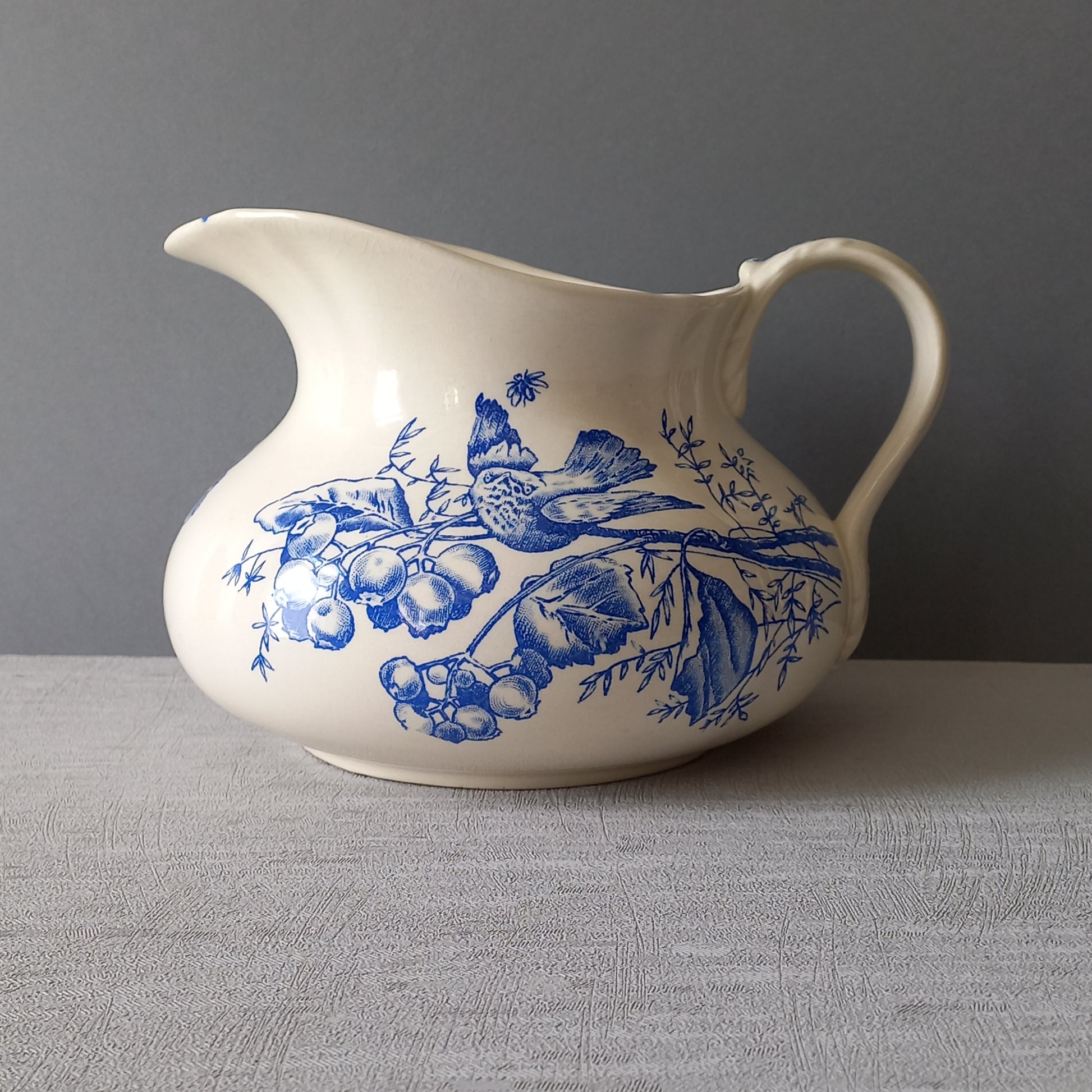 Antique ironstone jug/pitcher, white jug with blue bird and floral transfer pattern, bathroom and kitchen decor