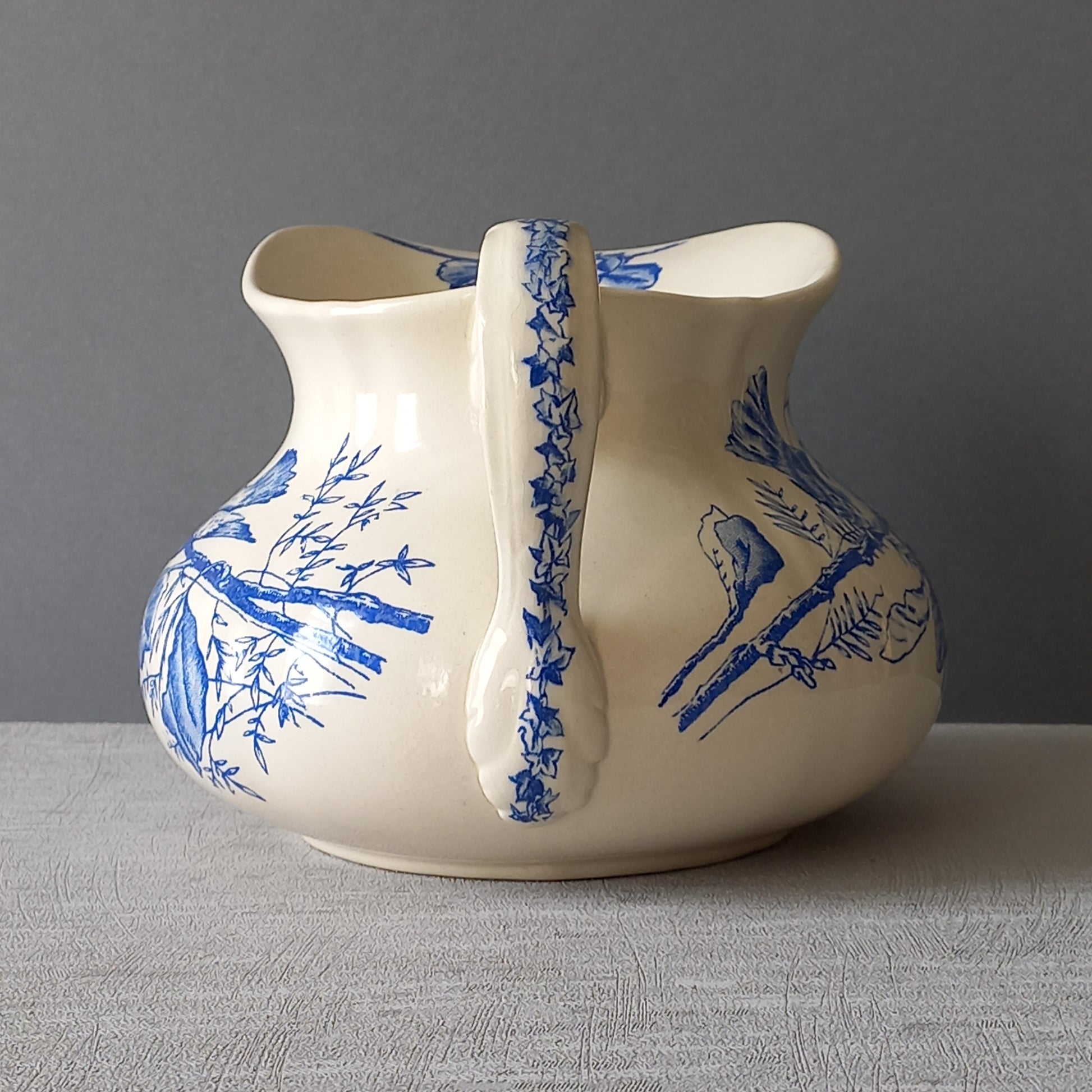 A French antique ironstone jug/pitcher in white with blue bird and floral transfer pattern. These jugs were once used to hold water and pour into a bowl for washing and these days are great as home decor. There is a maker's mark underneath for, H B and Cie. Circa. late 1800s to early 1900s.