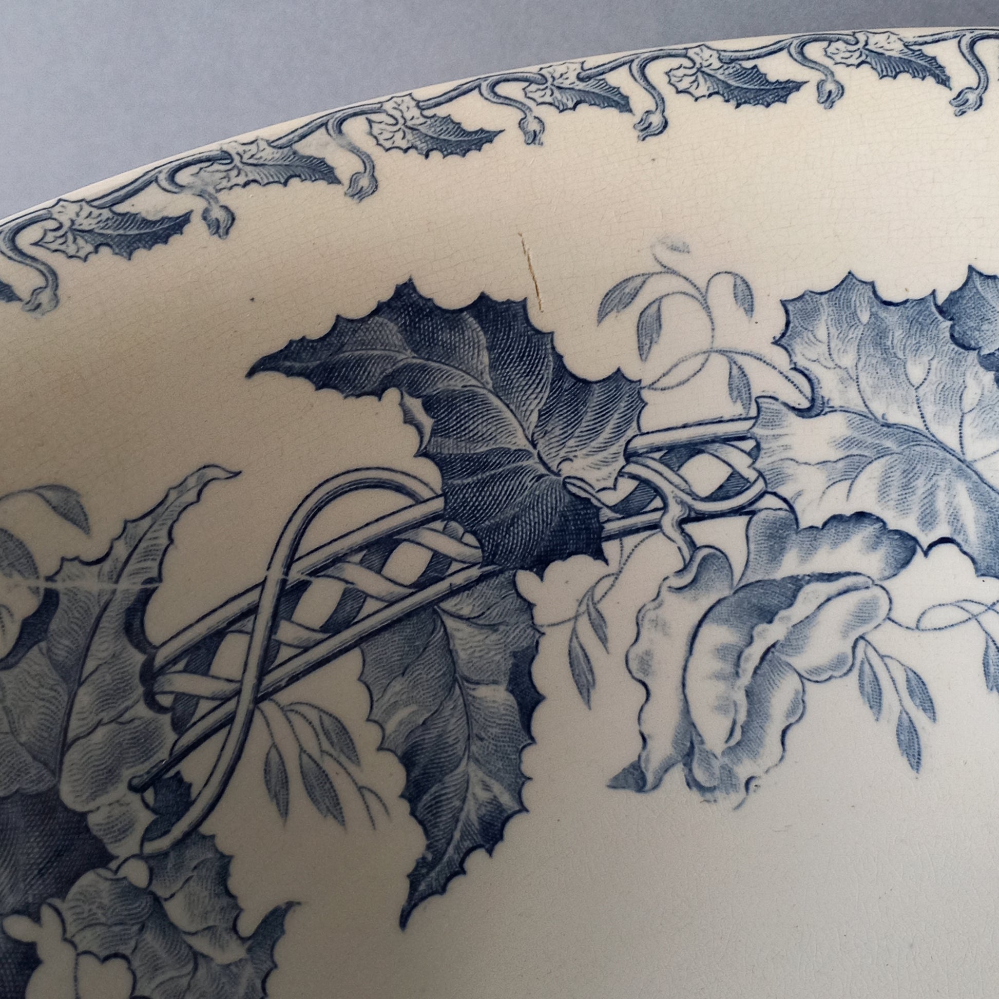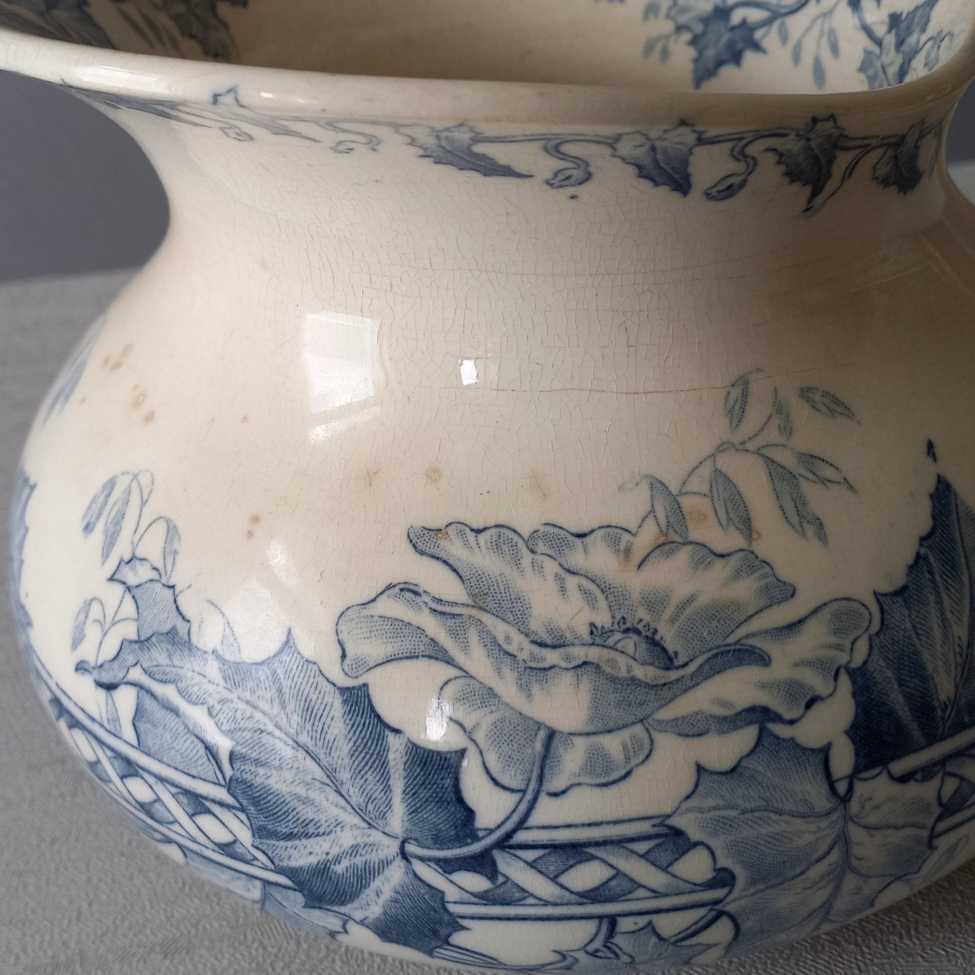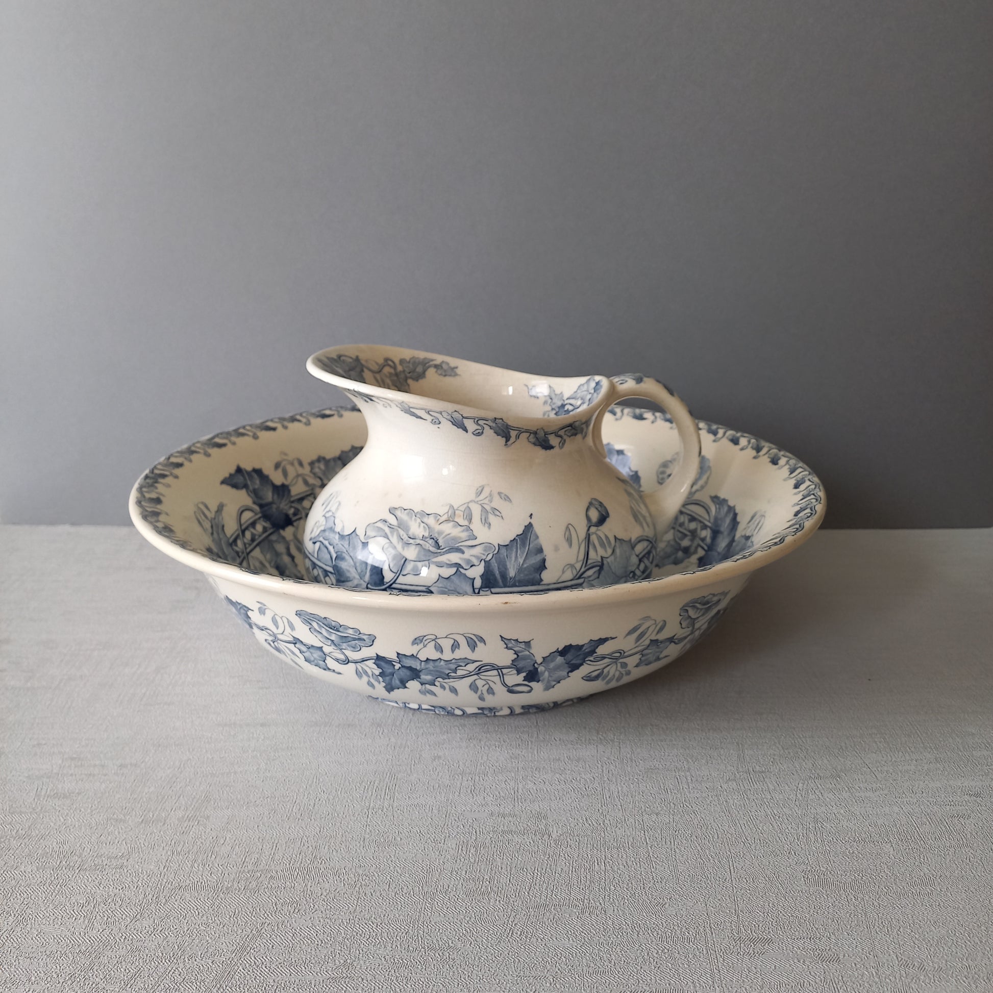 Description: A beautiful French antique ironstone pitcher and bowl set by premier manufacturer, Sarreguemines. This particular example has a wonderful blue floral ironstone pattern. These jug and bowl sets are becoming harder to find these days, especially in this condition. Being an antique item (circa. late 1800s to early 1900s) there are some small imperfections, although nothing to detract from this item's beauty - please read condition details below and view all the photos.