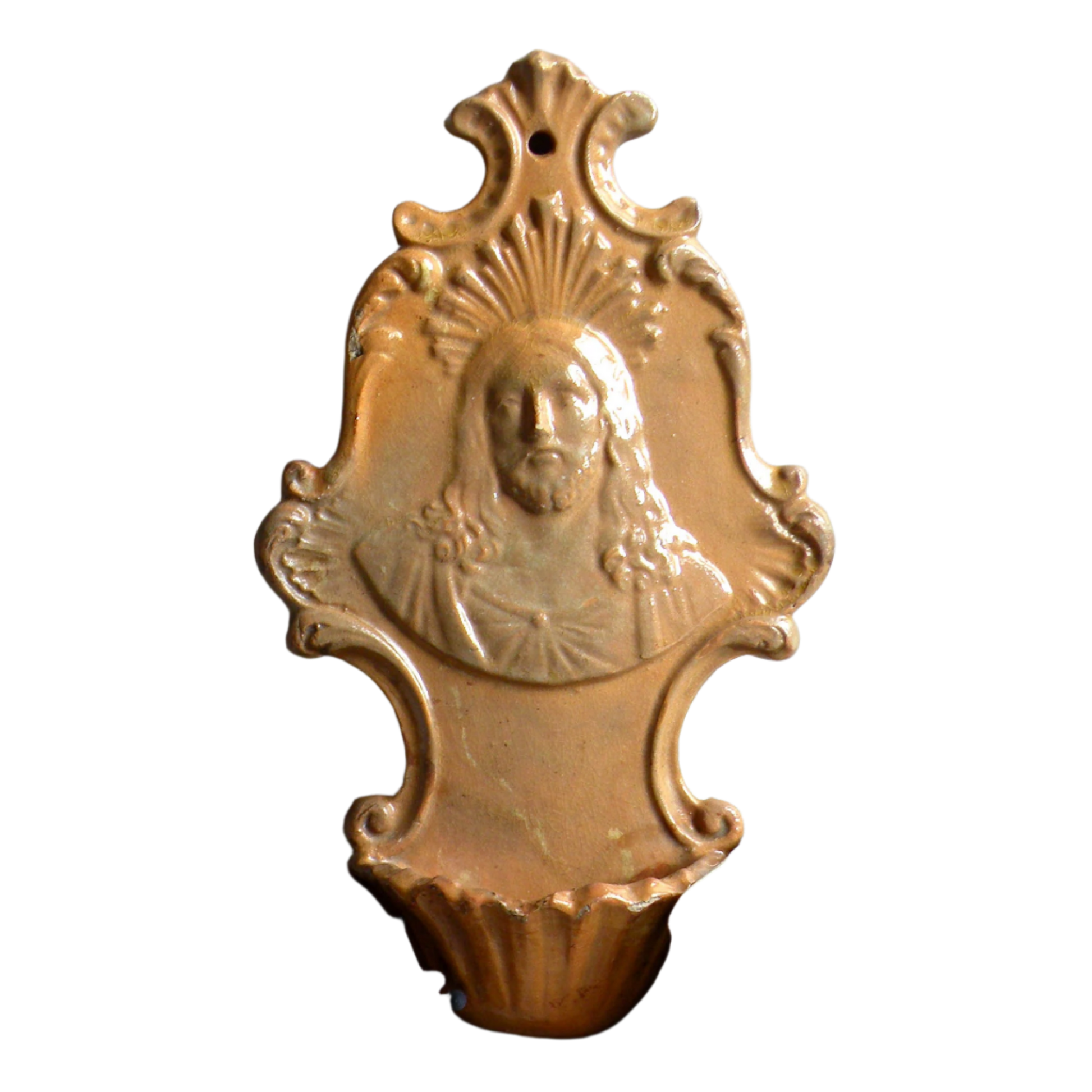 A beautiful vintage glazed stoneware religious water font with Jesus Christ in relief; I bought this tasteful piece from a French antique dealer in the Charente Department of France, There is a hole for hanging on the wall.