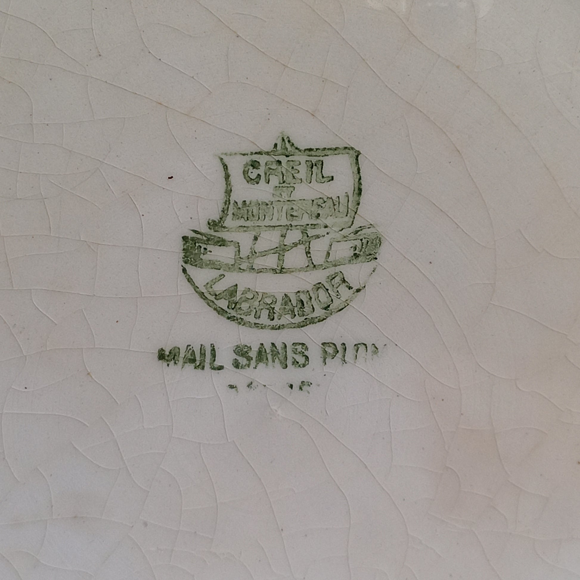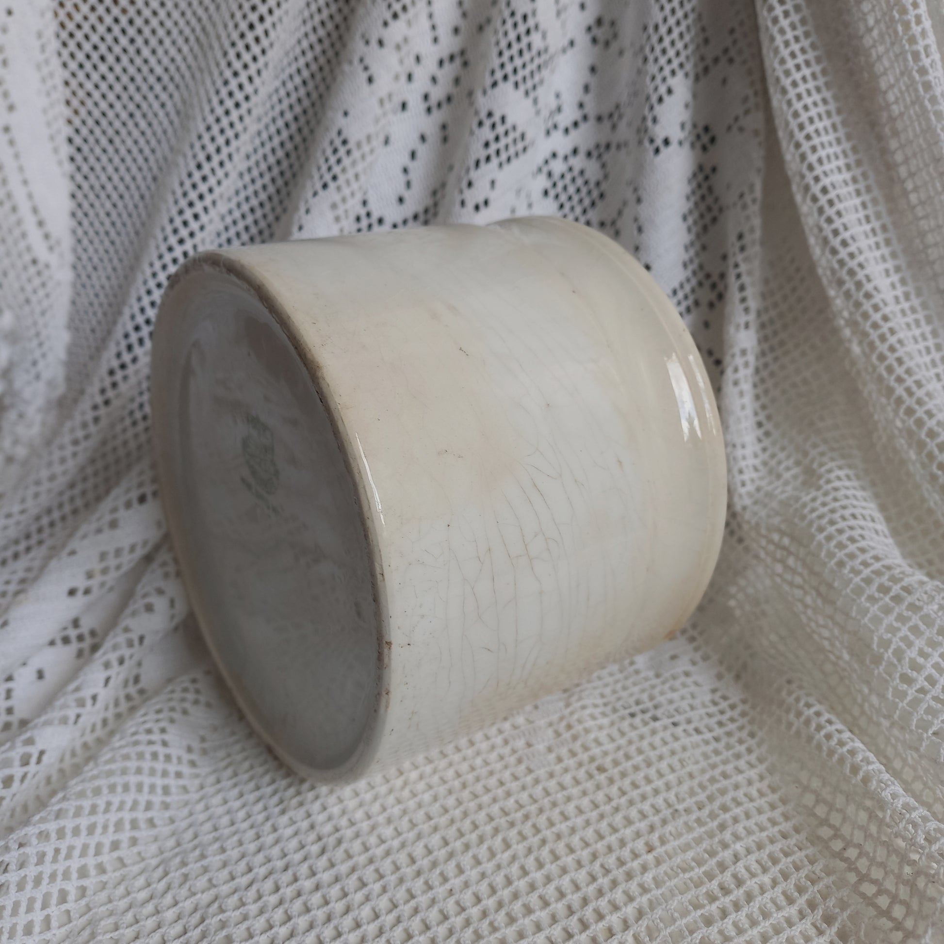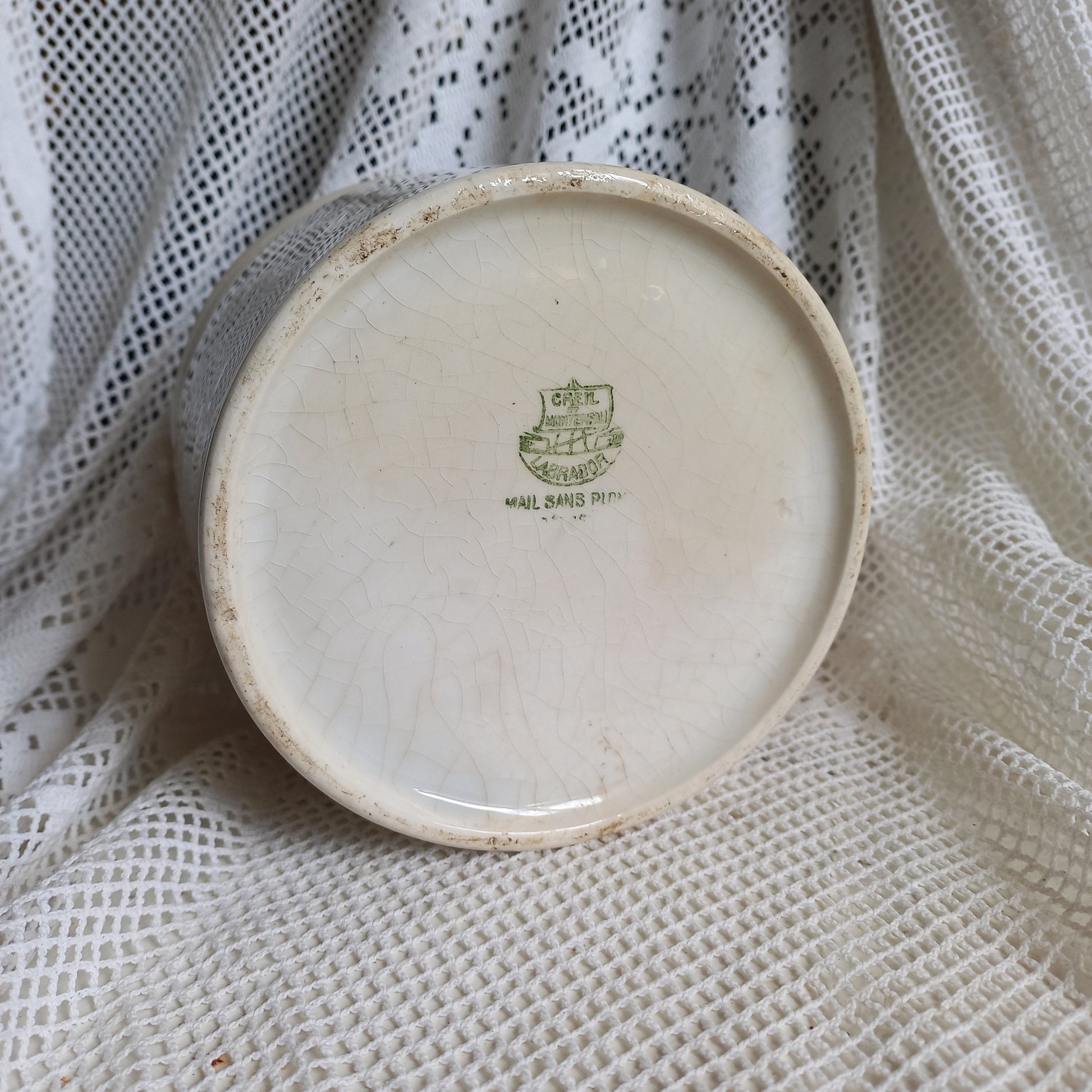 A French antique tea-stained and crazed white ironstone crock pot or preserve pot. In the past these pots were quintessential pieces in French kitchens for storing jam, etc, and these days are still just as useful for items such as utensils. This one was manufactured by Creil et Montereau. Circa. 1894 - 1920.
