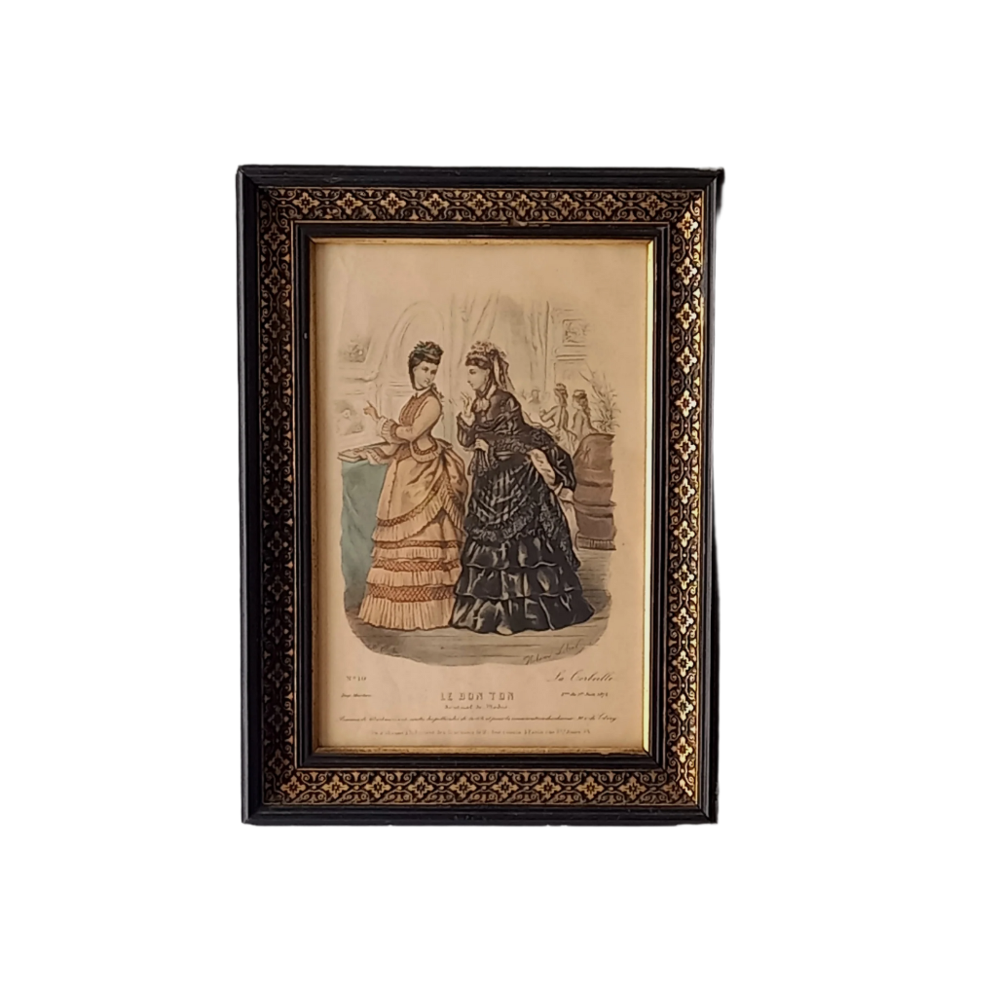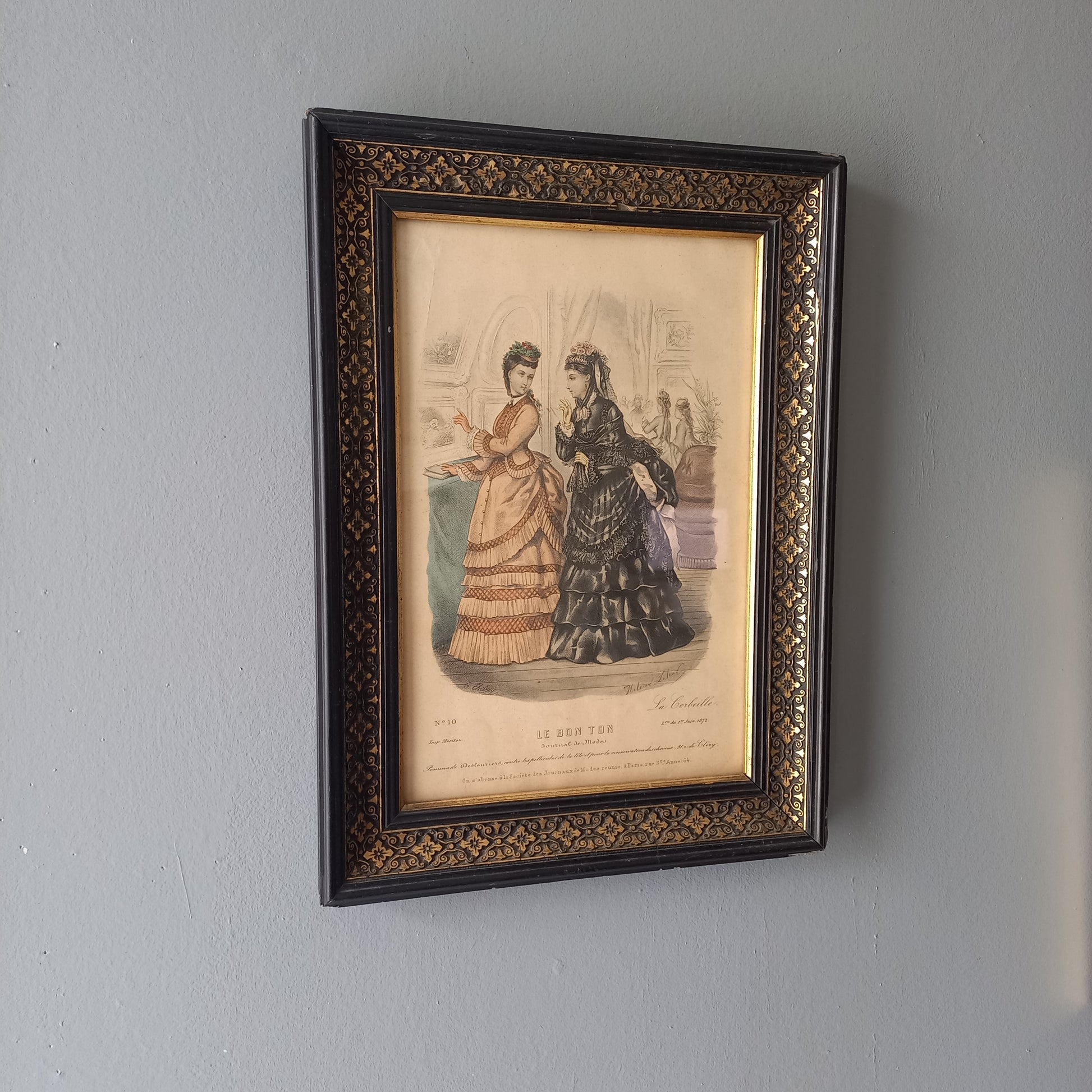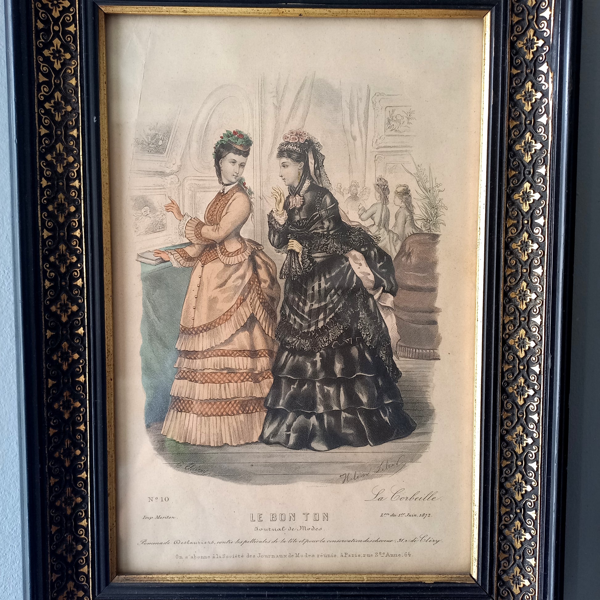 A fabulous antique fashion print depicting French women's high fashion of the late 1800s (1872) - it's presented in this beautiful old black and gold wooden frame and has a glass front. A truly beautiful piece.