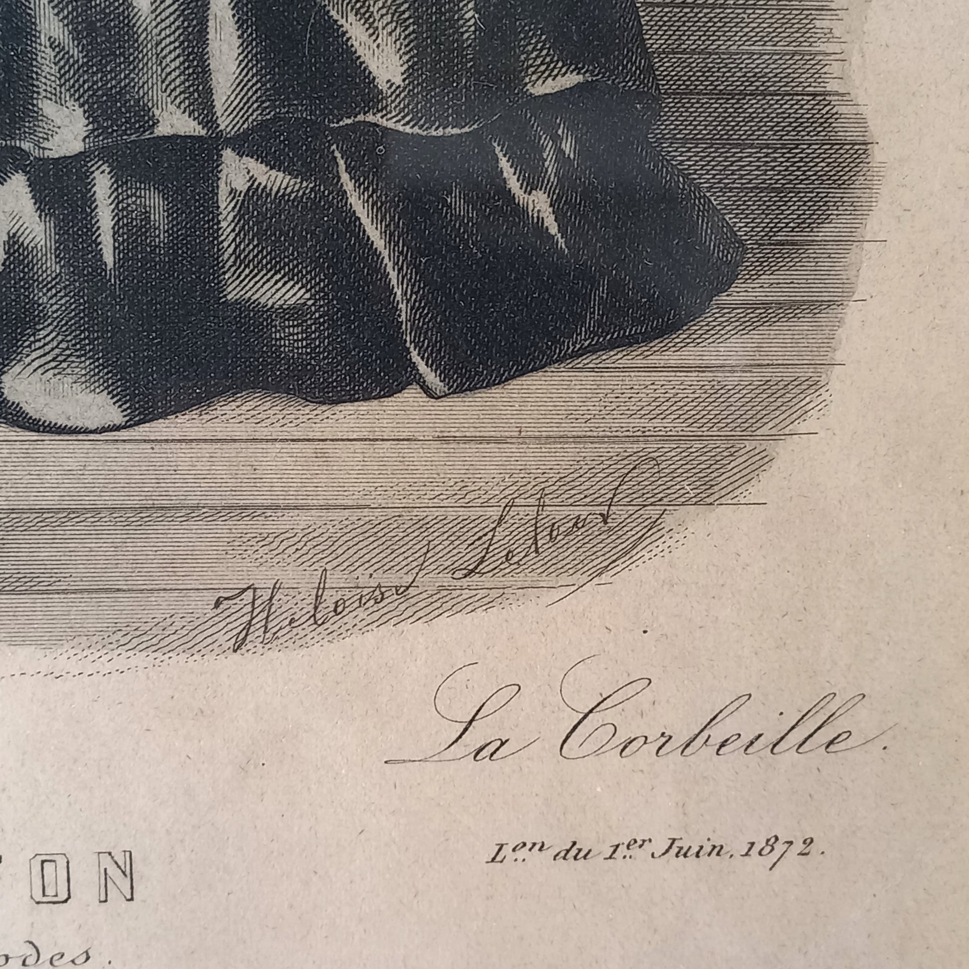 French antique women's period dress fashion print in decorative black frame, 1870s women's fashion, fashion wall decor,