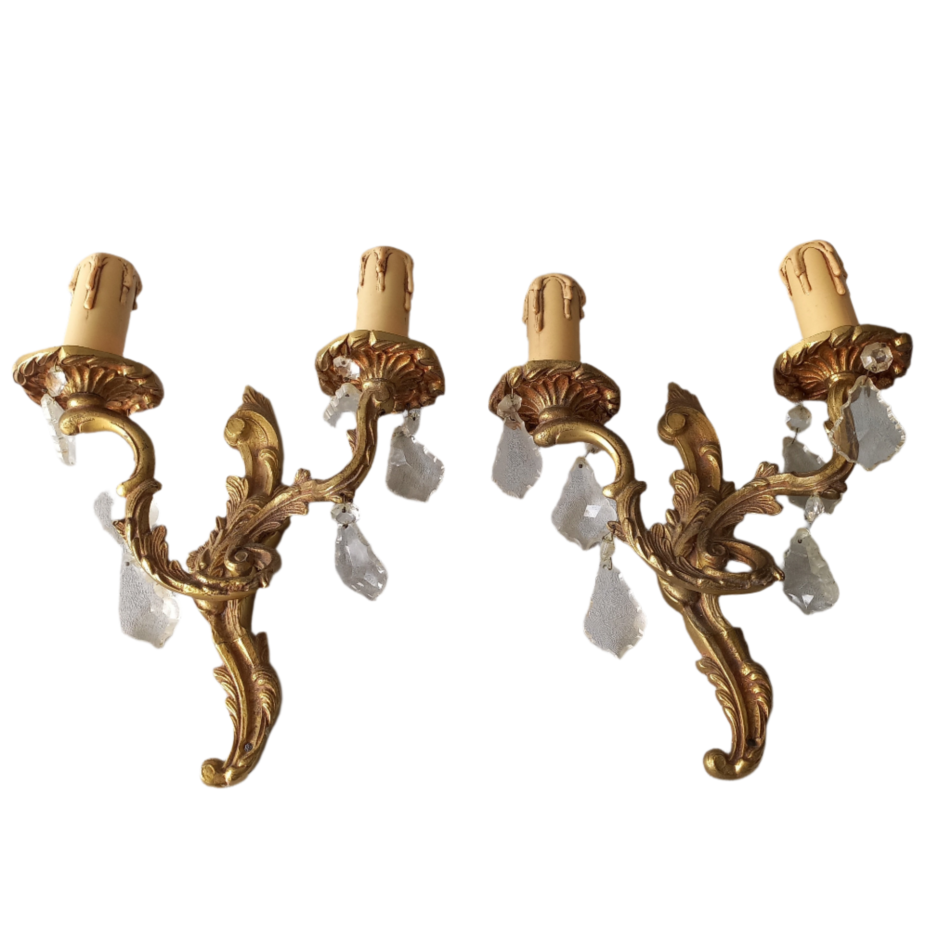 A pair of small French decorative wall lamps/sconces, vintage reproductions based on antique designs - each lamp has two lamp holders for two small screw-type bulbs (not supplied) and pretty glass hanging crystals. These will look fantastic once illuminated on your wall.