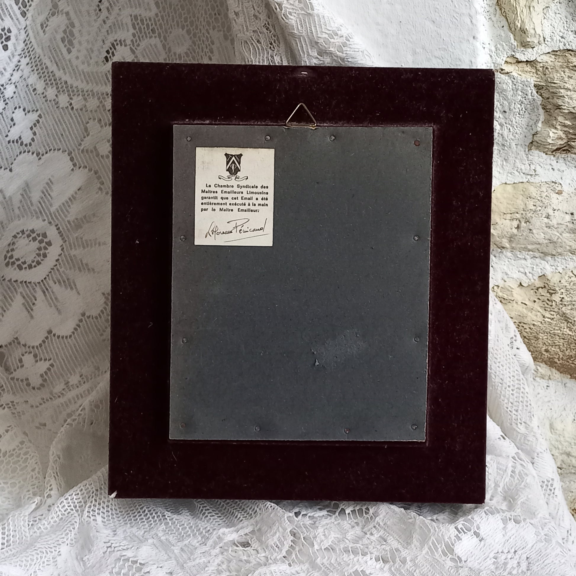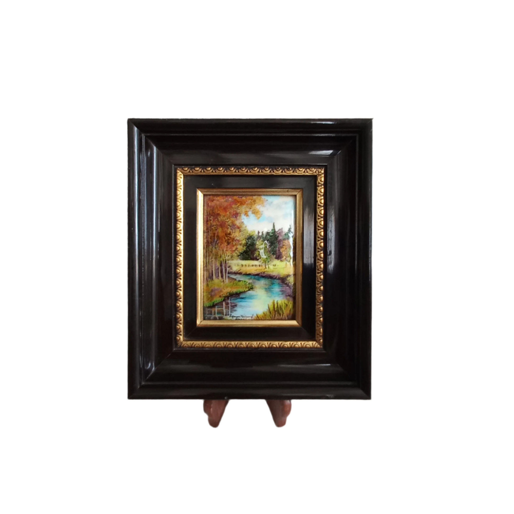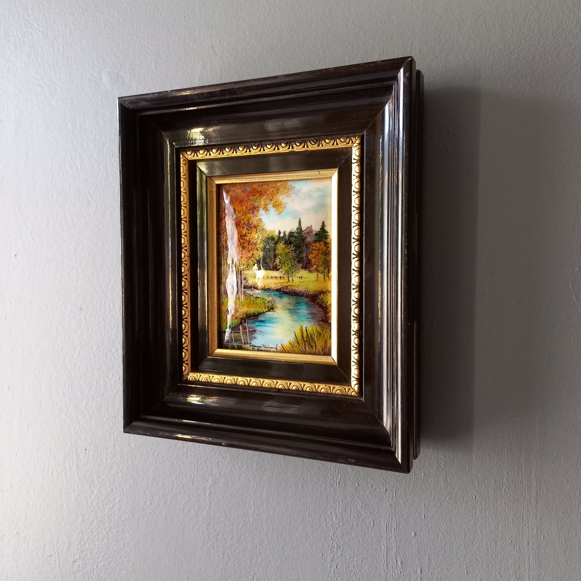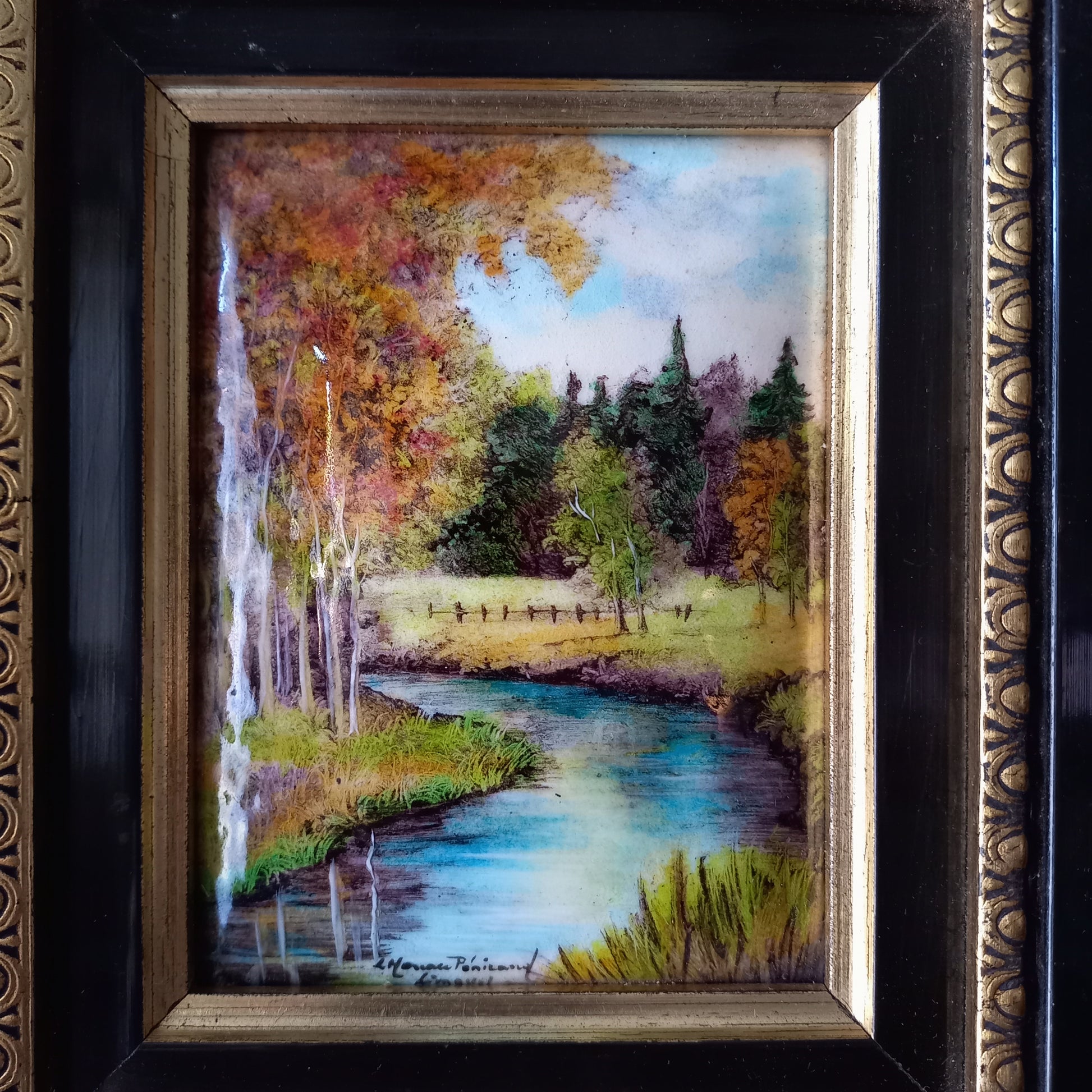 Description: A beautiful French vintage enamel landscape painting with picturesque trees and river scene handcrafted, signed by the artist and presented in decorative black frame. To the rear is a label from 'The Union Chamber of Master Enamelers Limousin' that guarantees the enamel work was created by hand, by the master enameler, and there is a hand-signed signature on the label too (see photos).