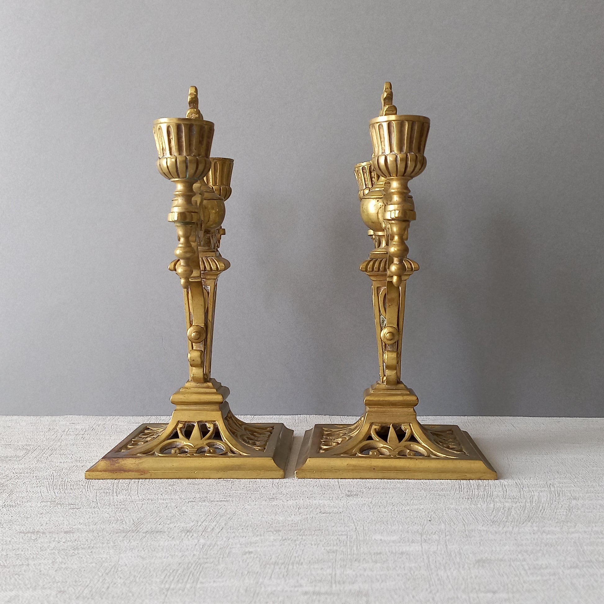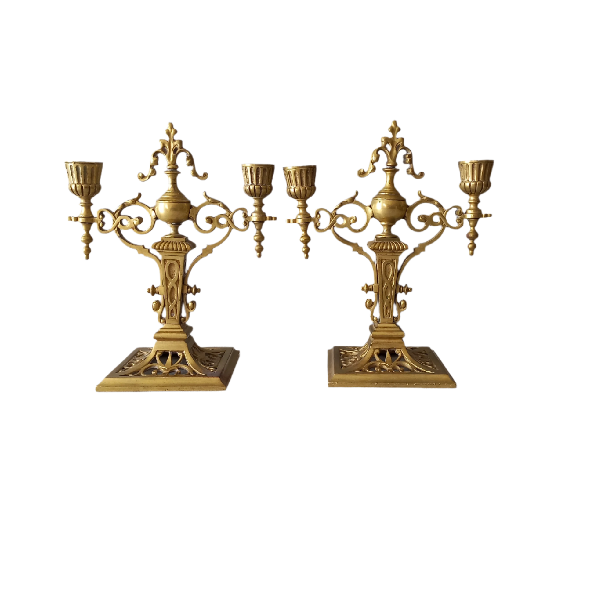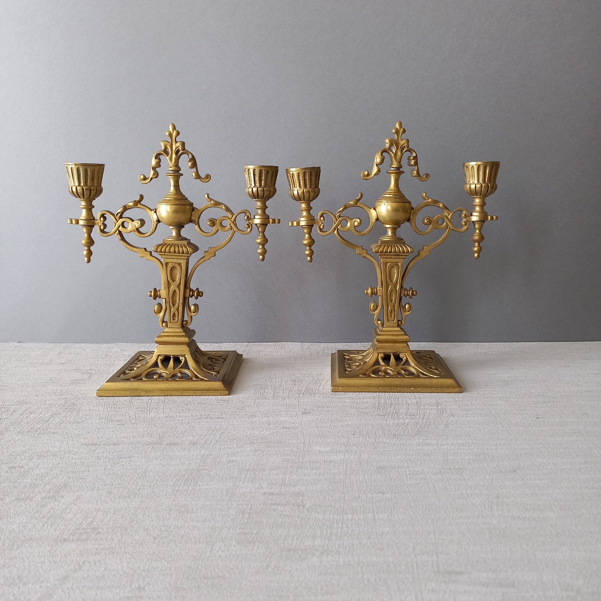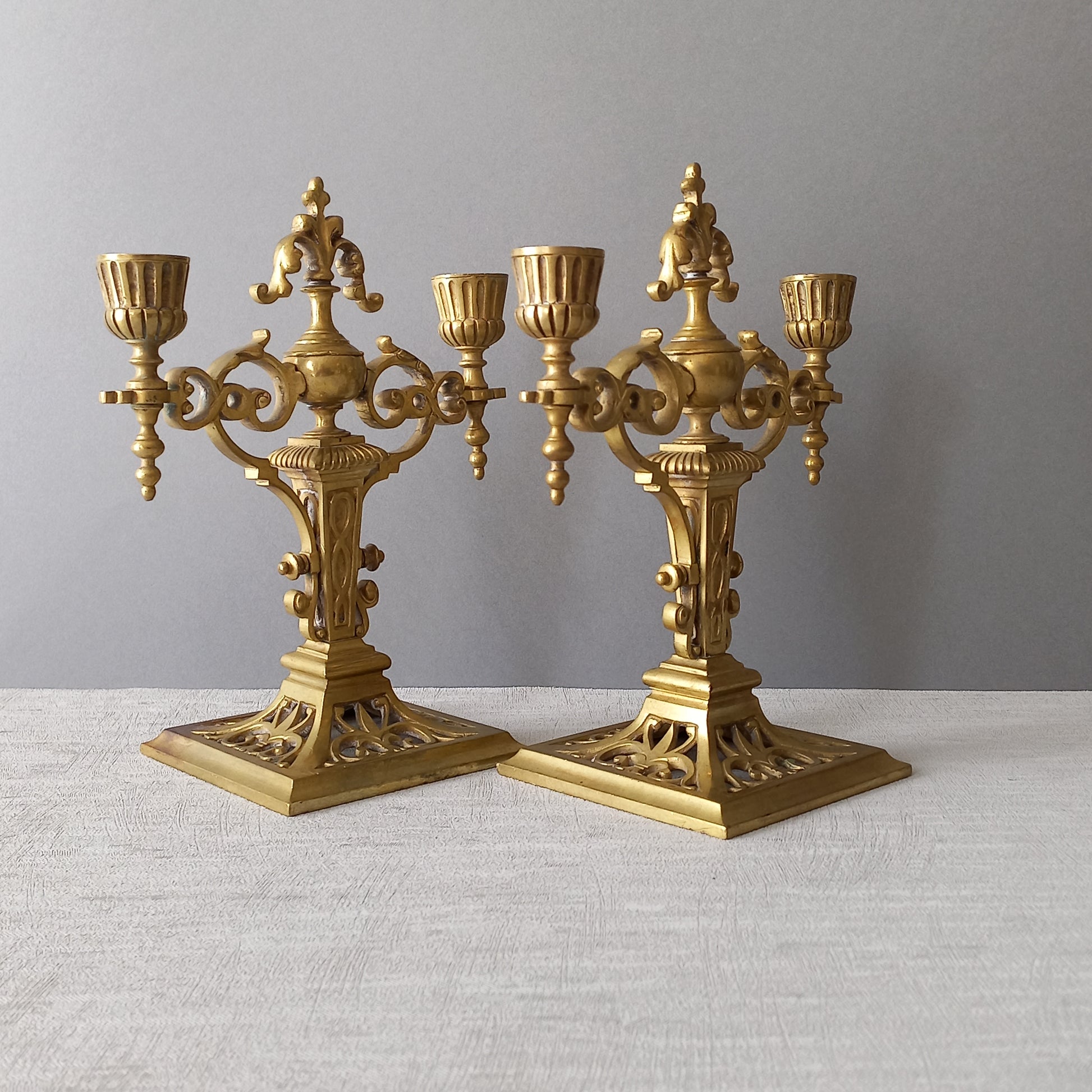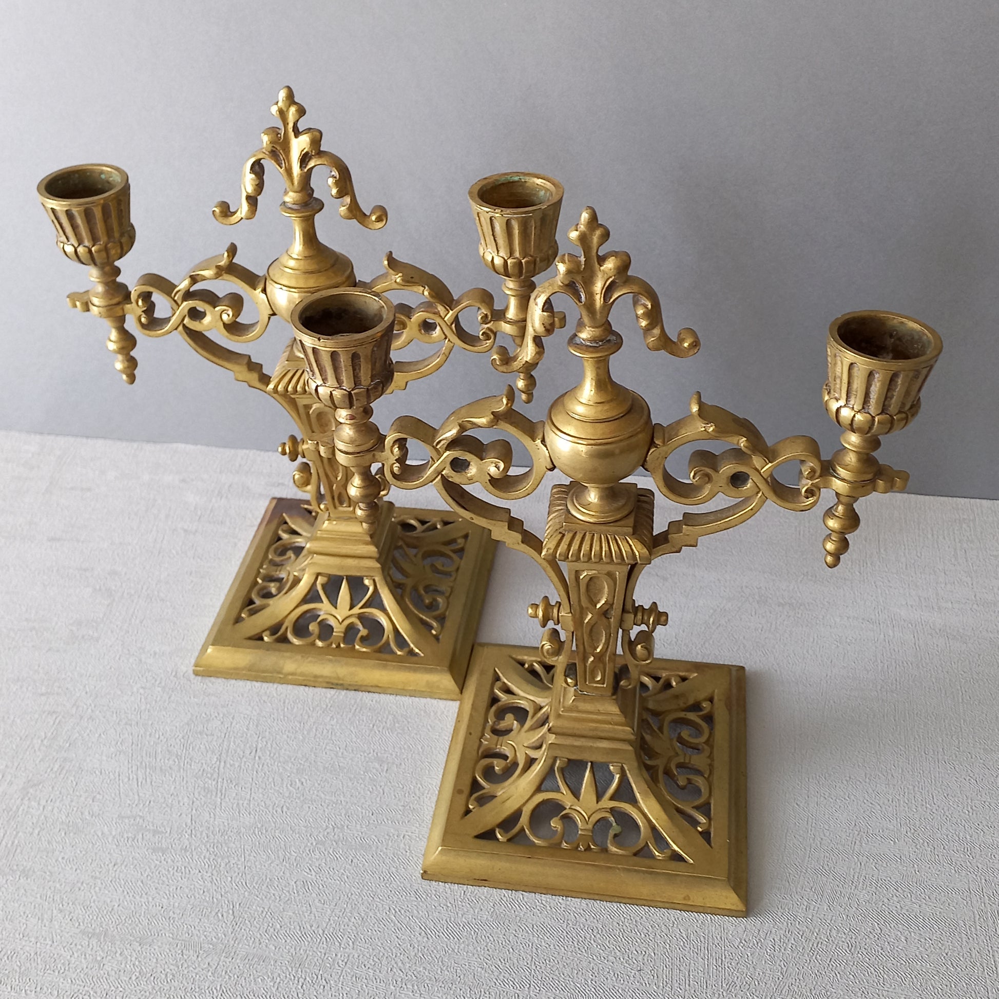 Pair of French Antique Brass Candle Holders, Decorative Candelabras