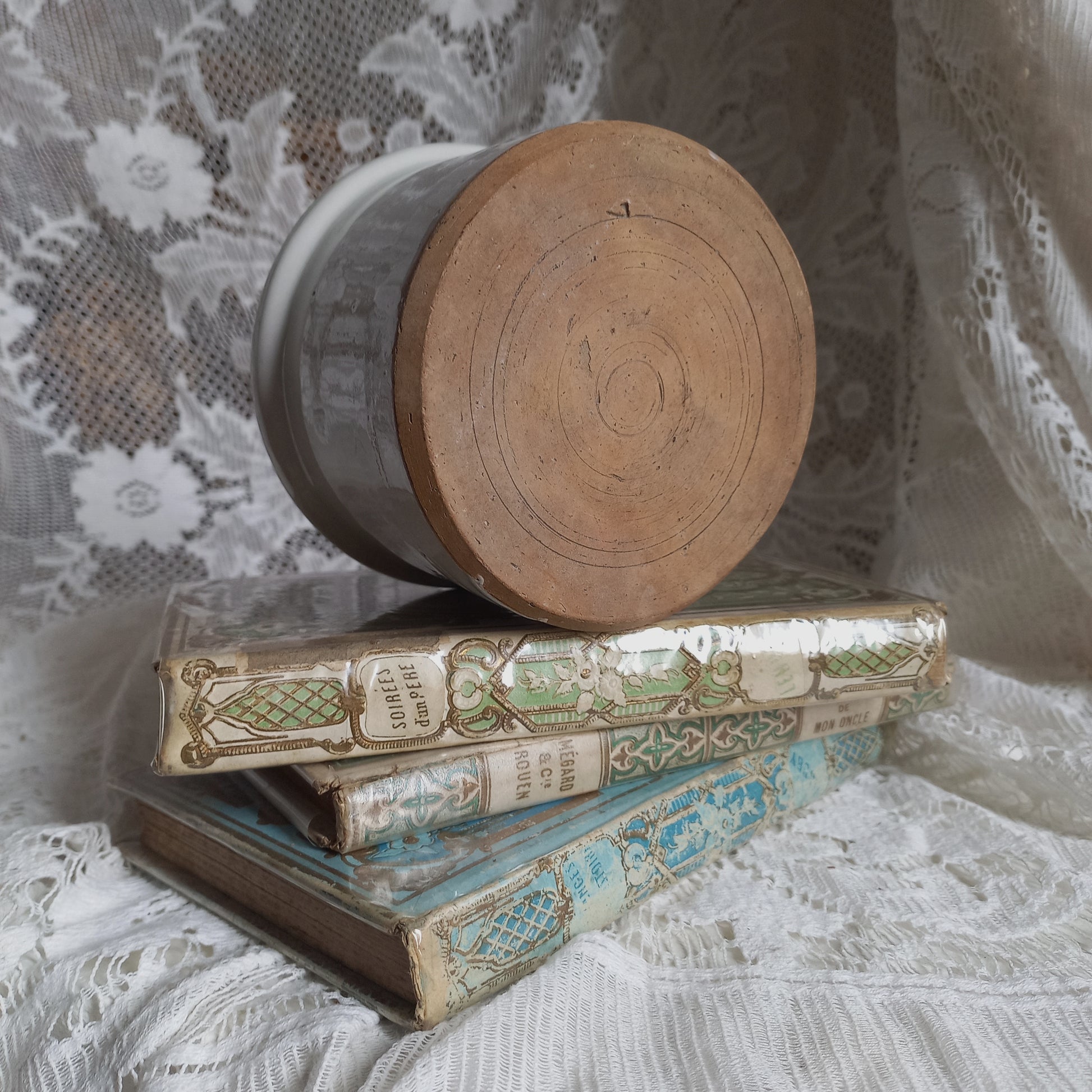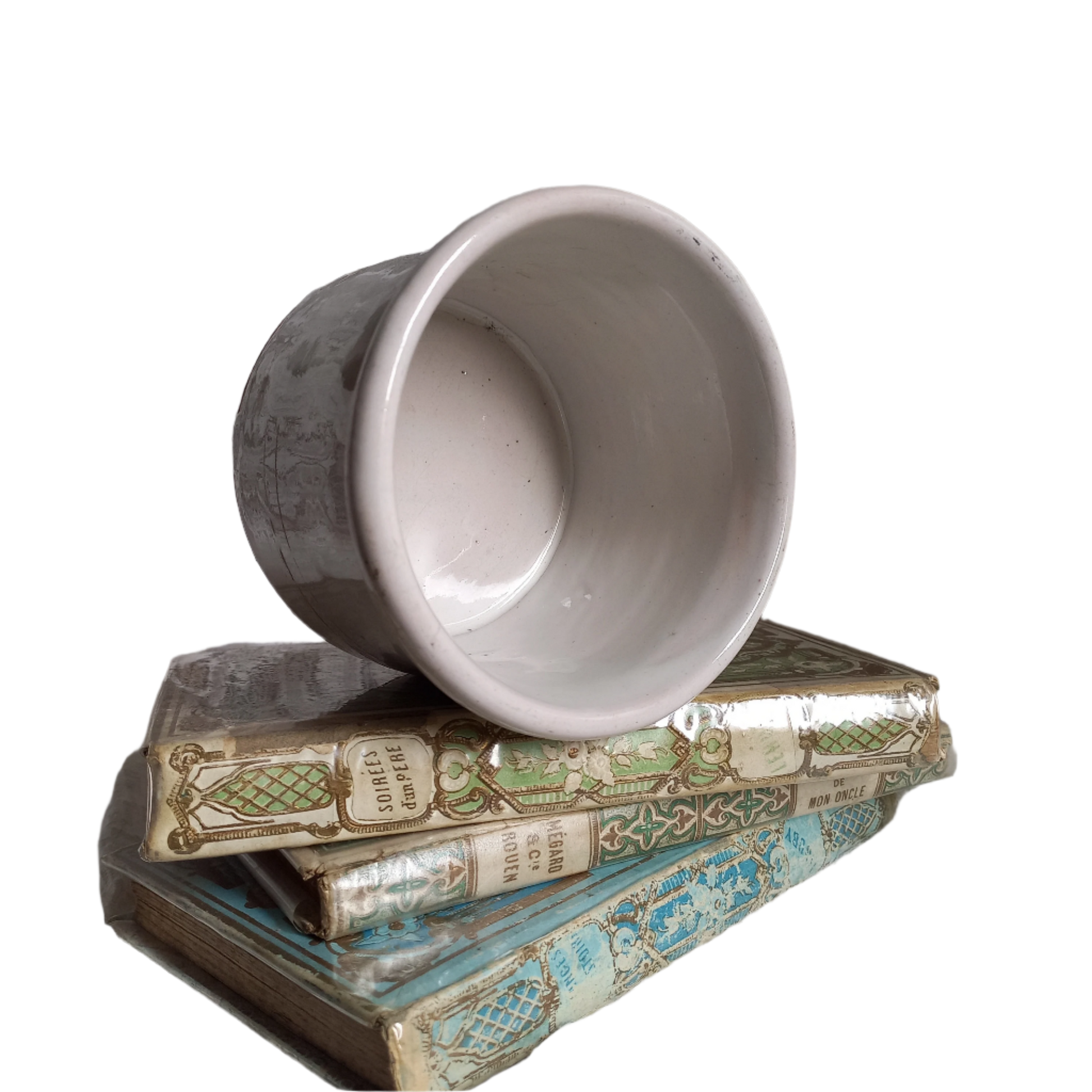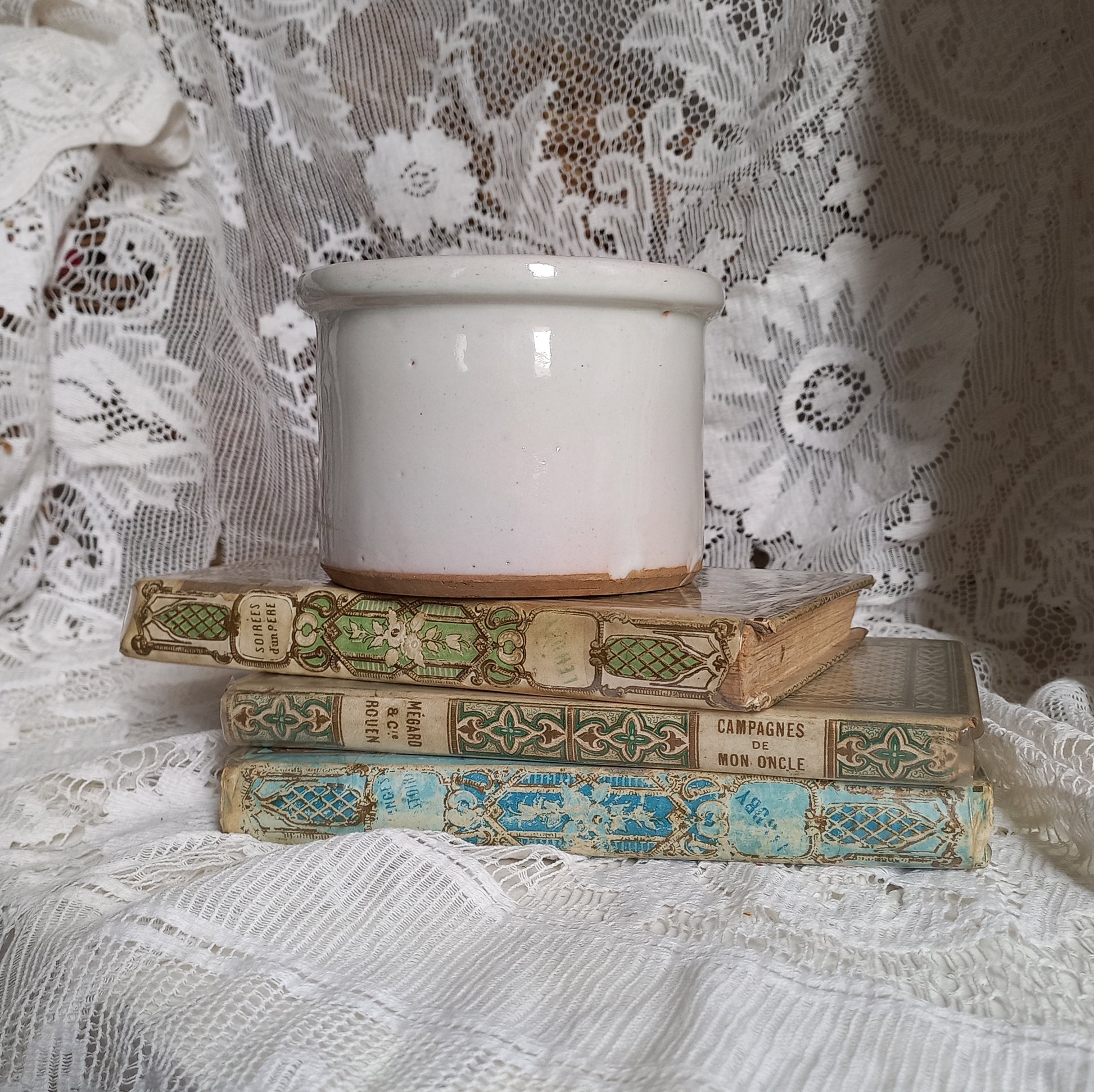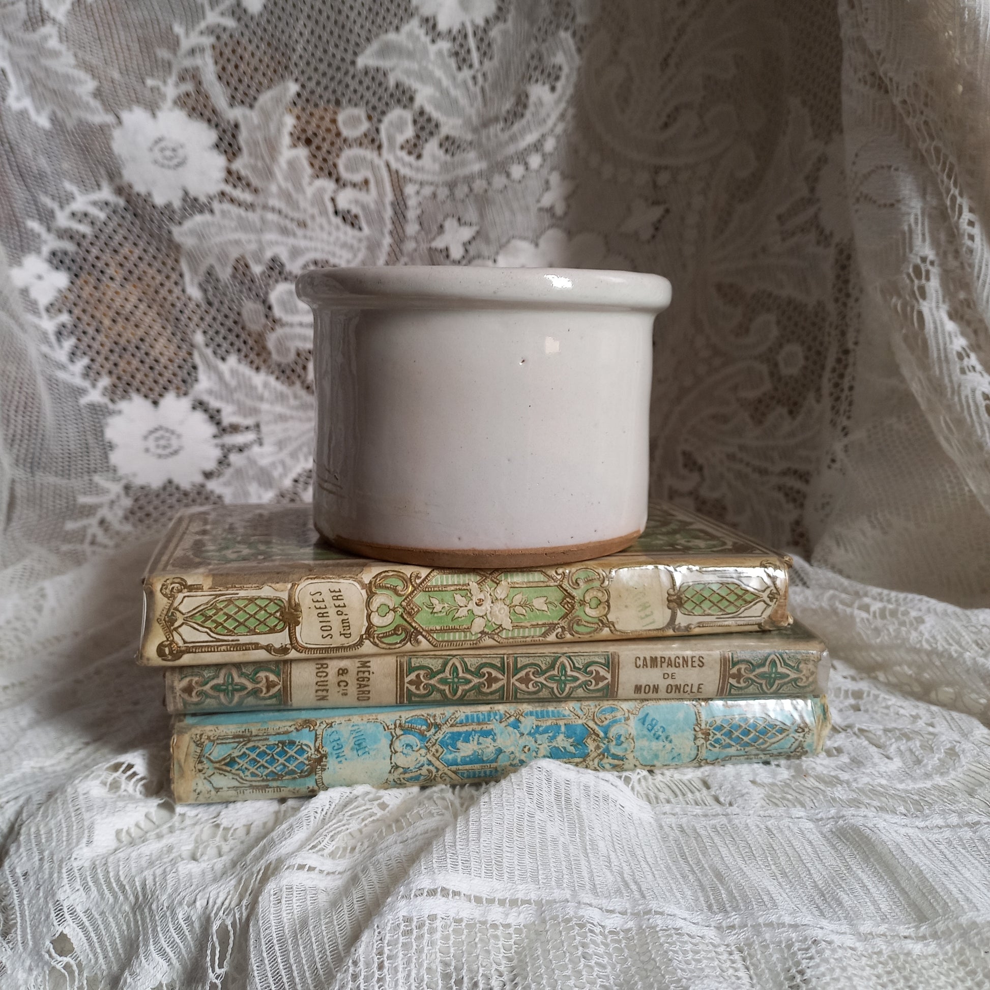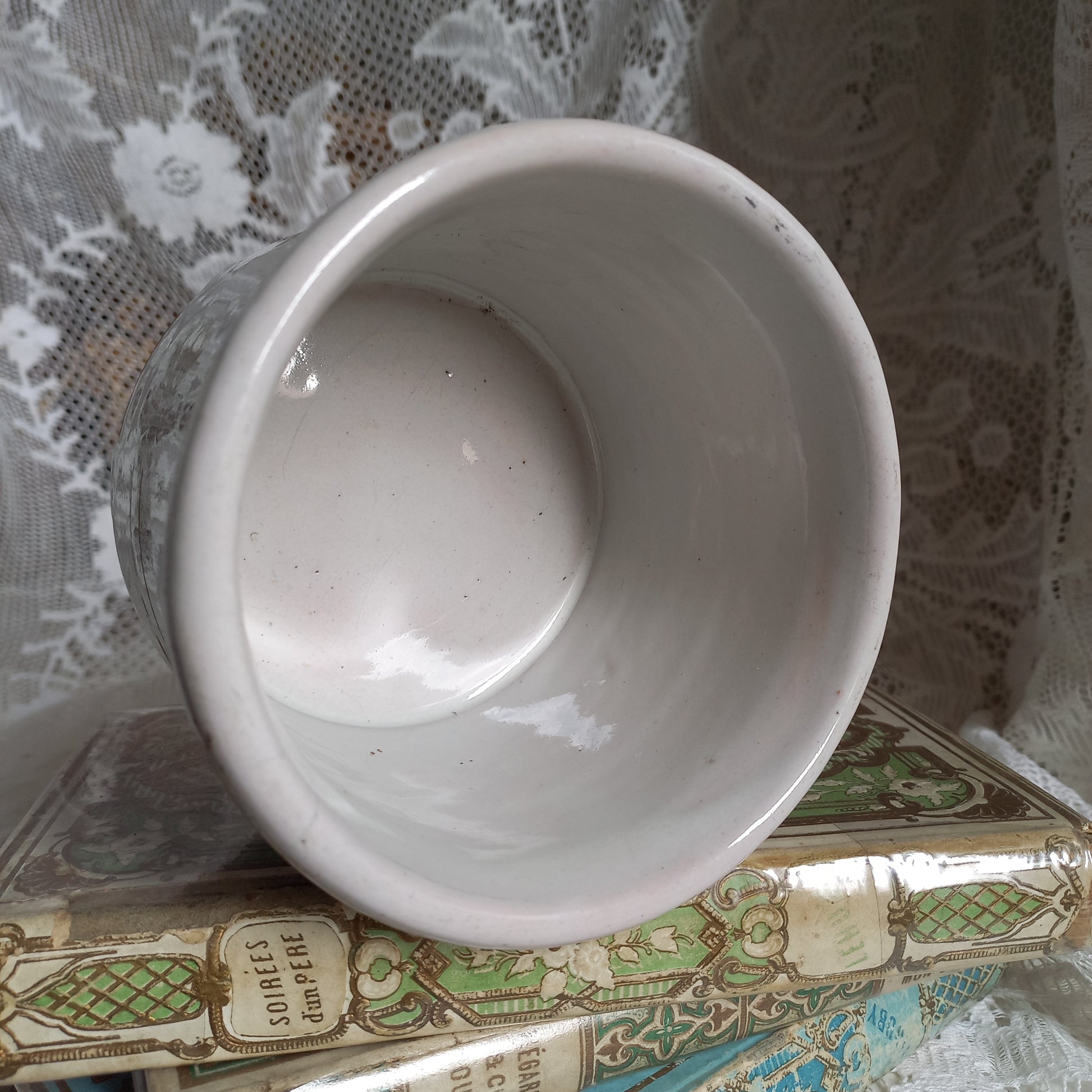 A French antique white glazed pottery jam pot, an ideal piece for kitchen utensil storage or perhaps a plant pot. Please see dimensions and condition details listed below.