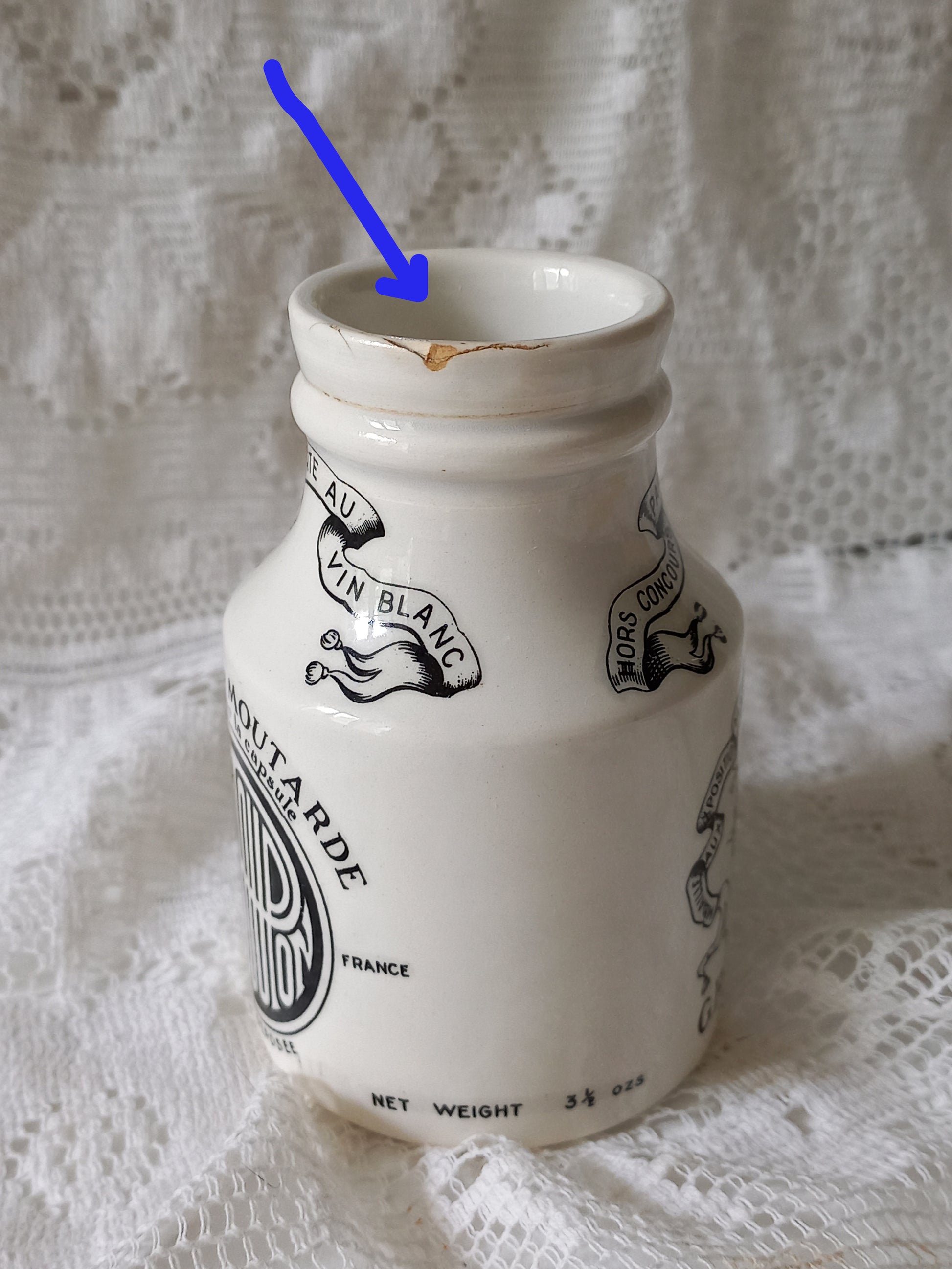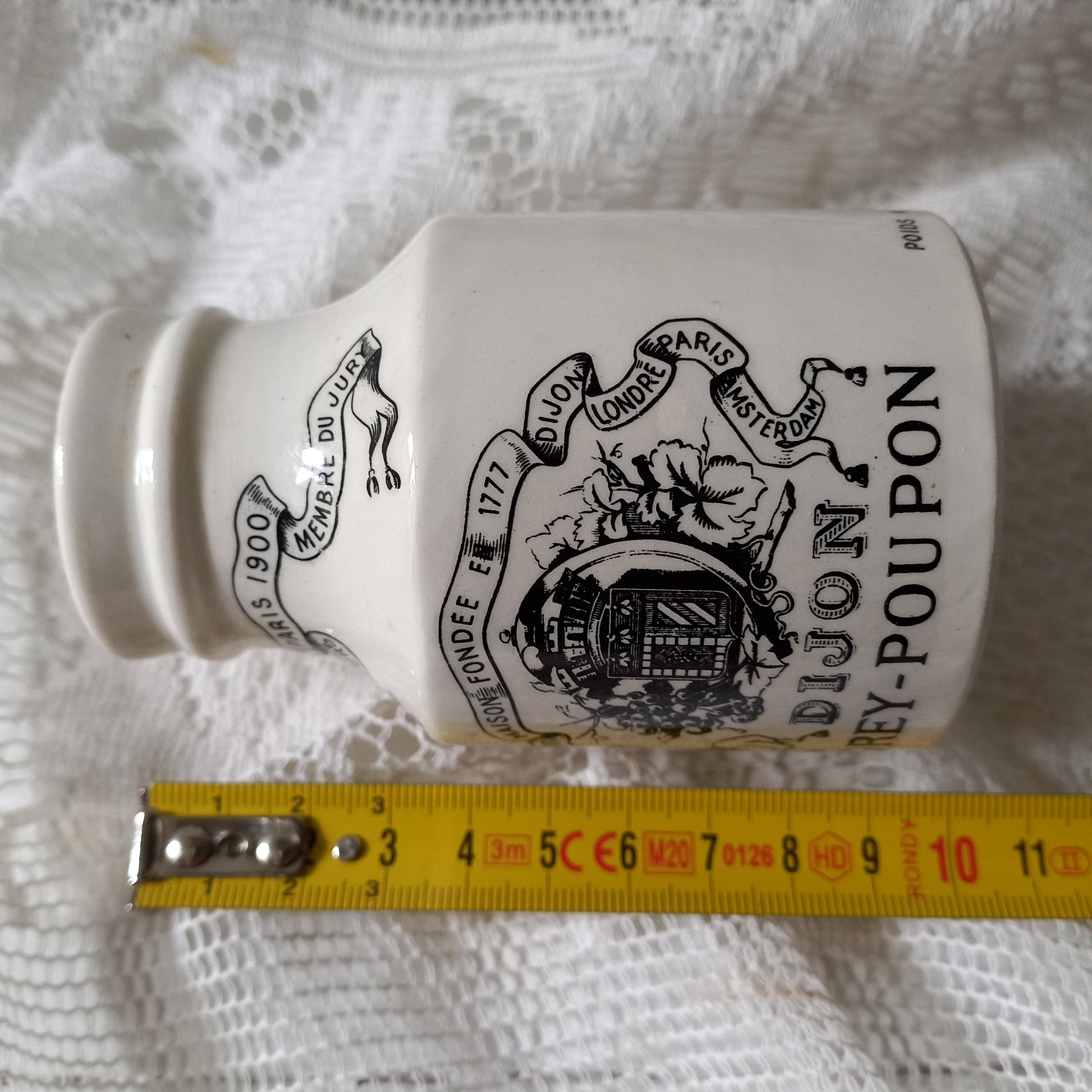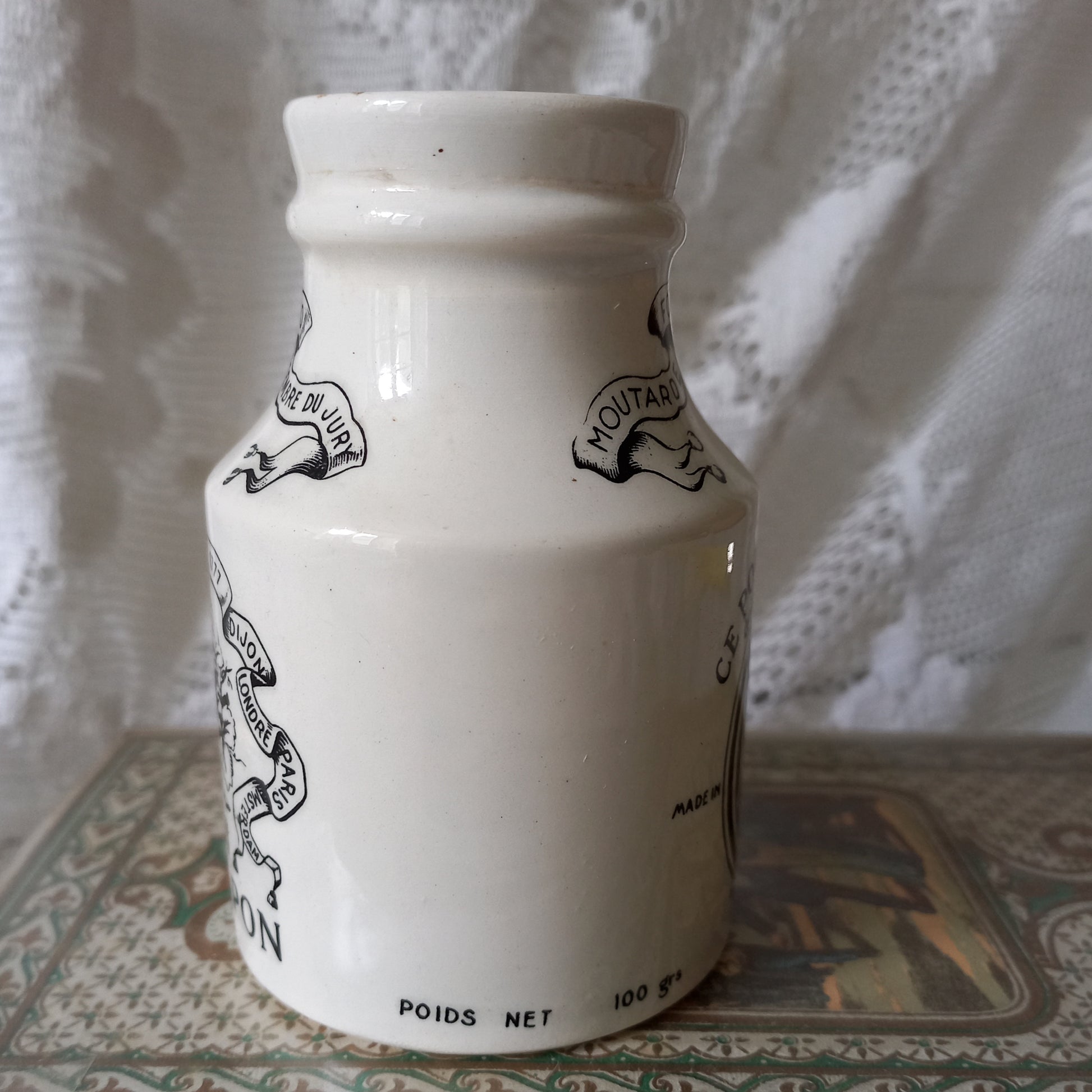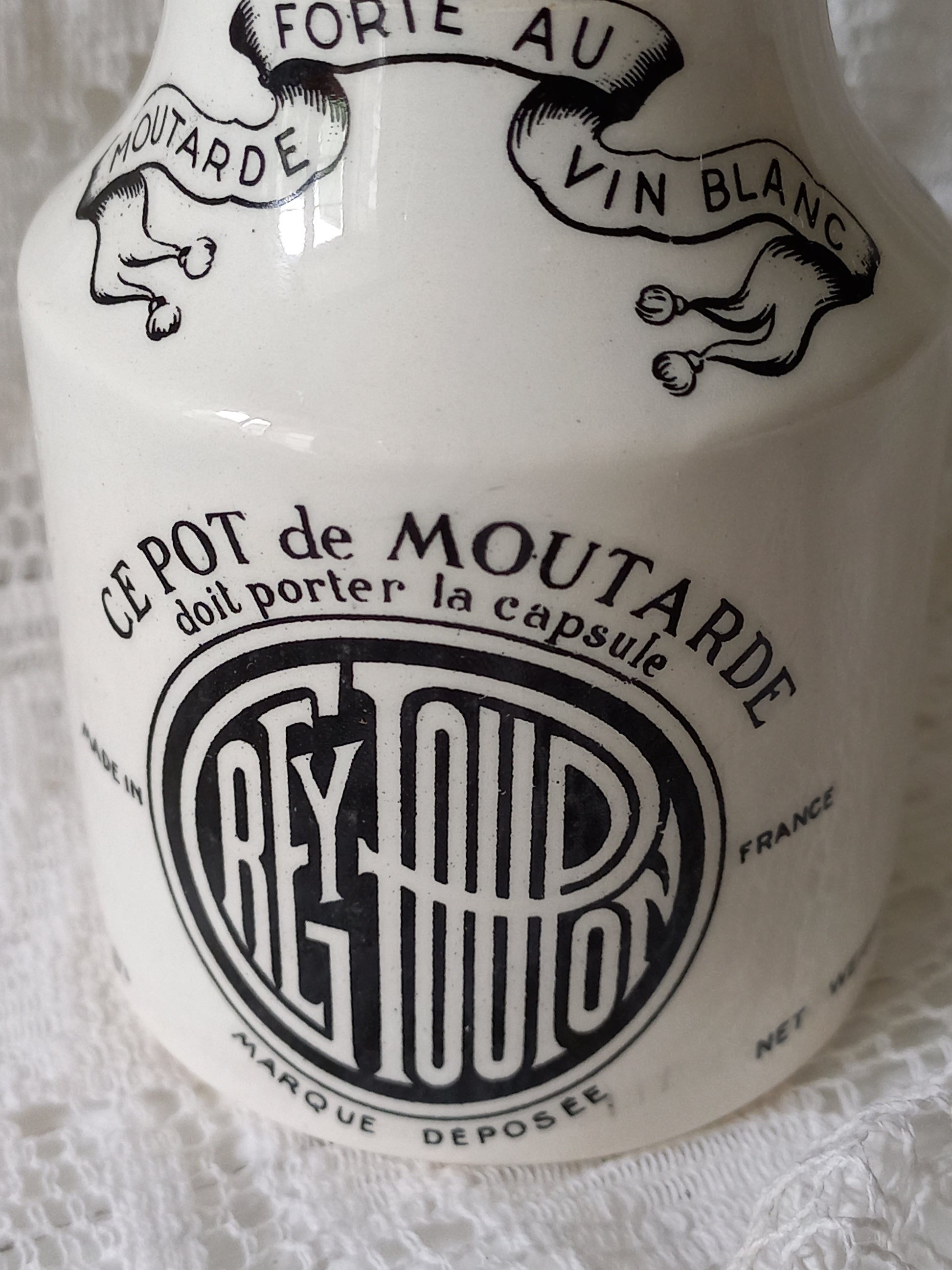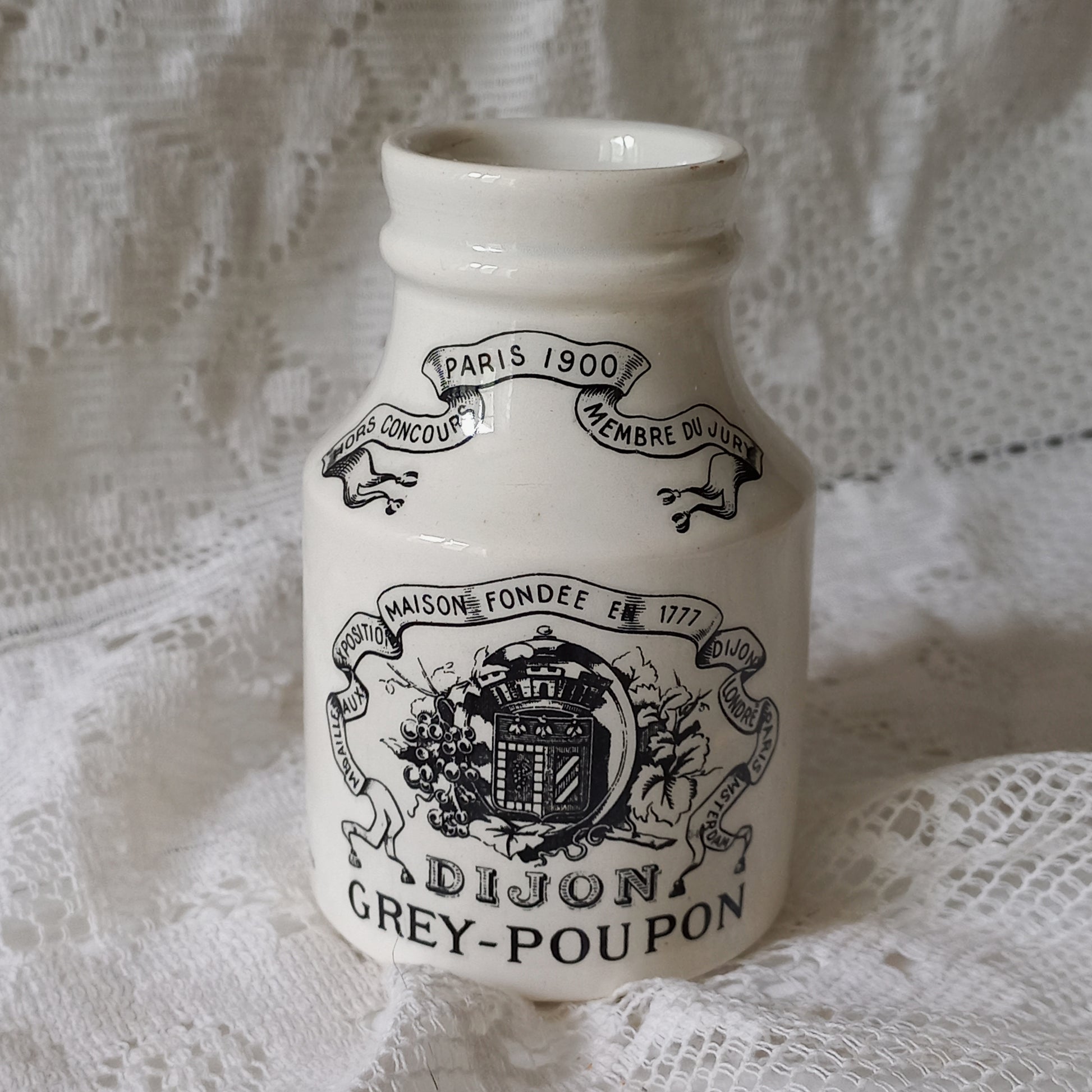 Small French antique white ironstone mustard pot for Dijon Grey Poupon by Sarreguemines, Dijon Grey Poupon Pot by Sarreguemines