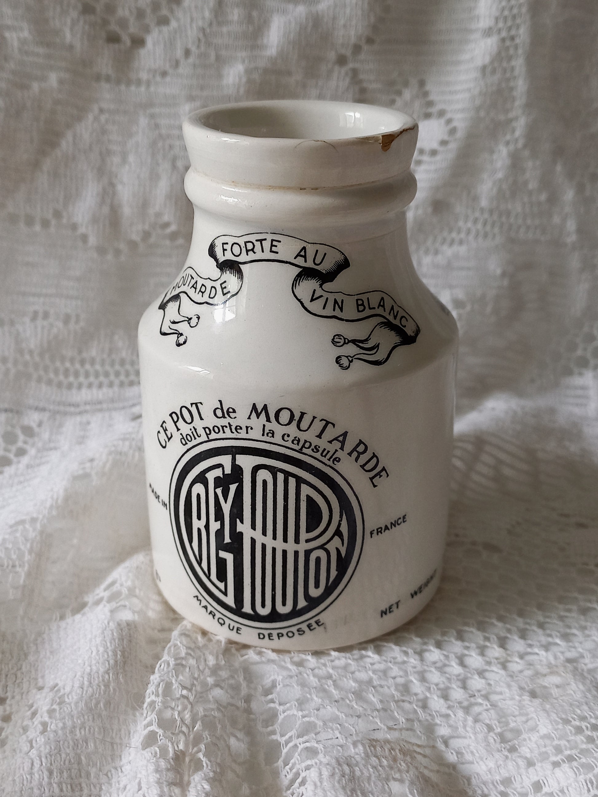 A small and beautiful French vintage/antique ironstone mustard pot. This wonderful old jar was made by premier French manufacturer Sarreguemines and the maker's mark dates this particular pot as circa. 1920 - 1950.