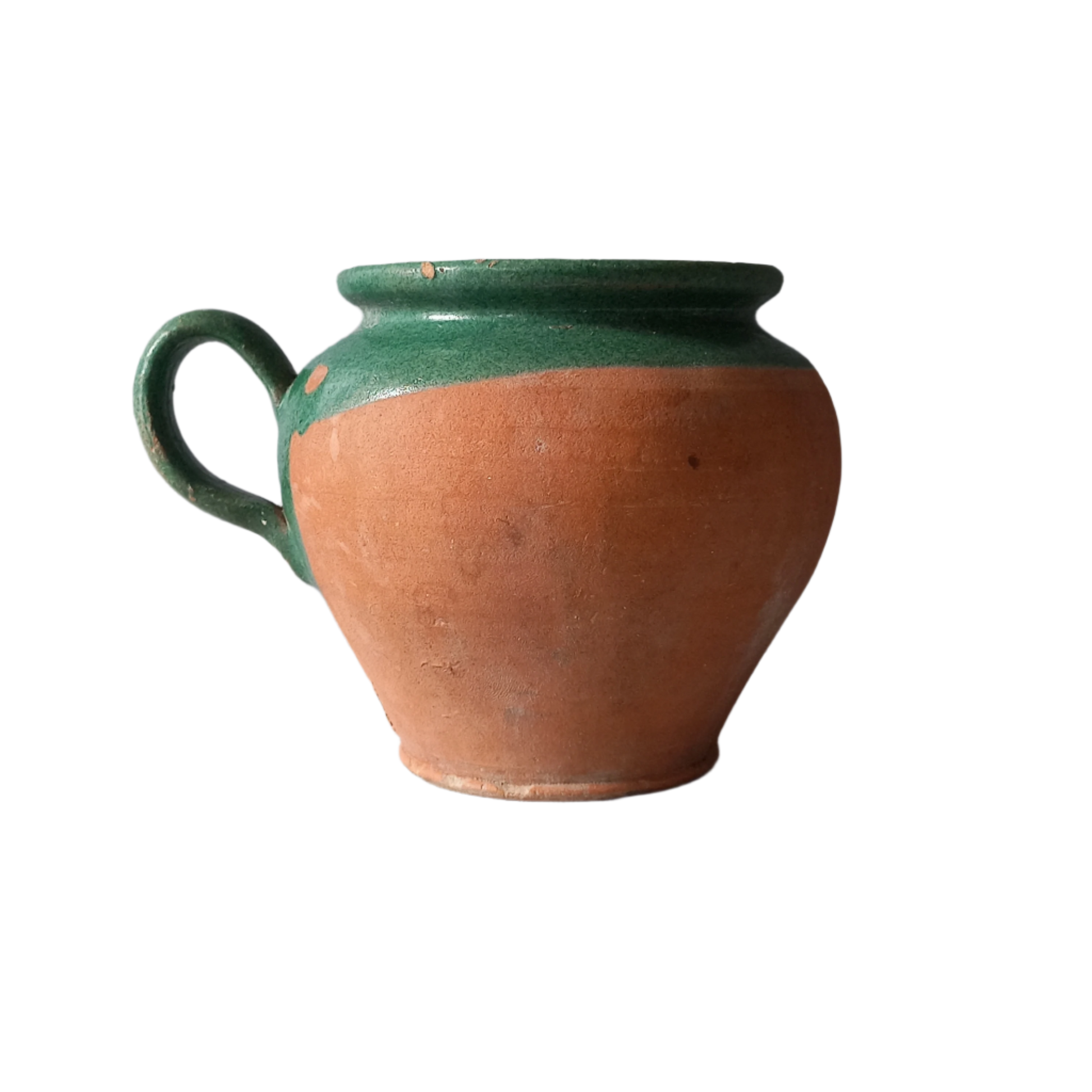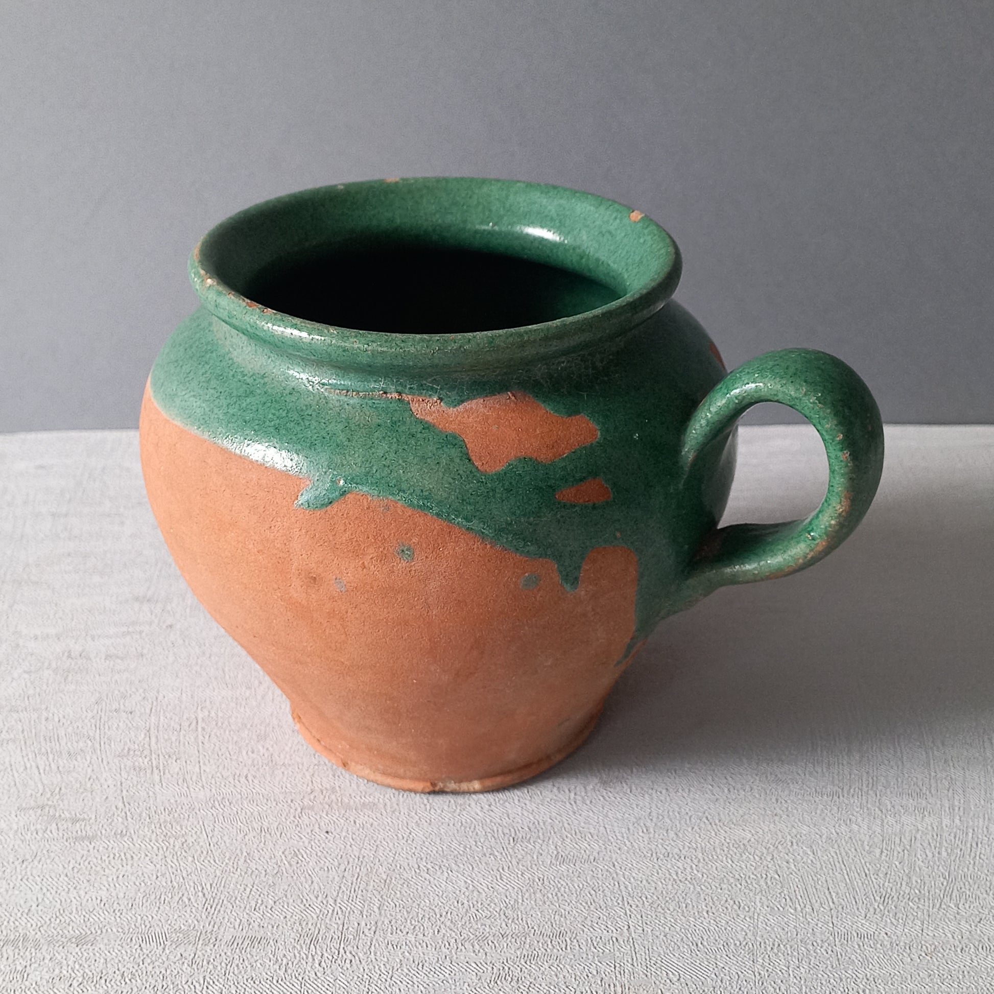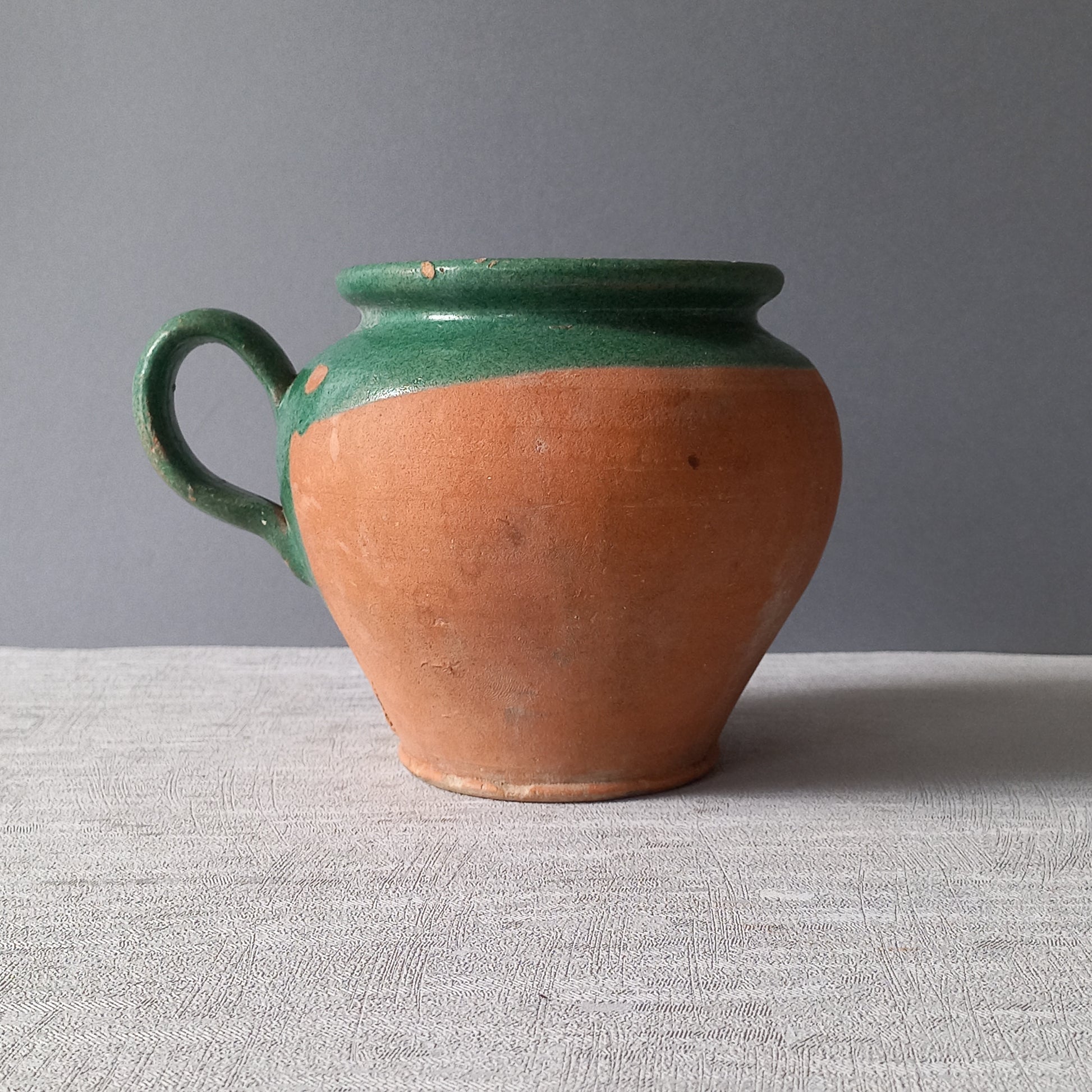 A small vintage pottery jug partially glazed on the outside (and fully in the interior) with a wonderful shade of green. This French jug looks super as a practical piece of home decor. There's some old staining to the exterior surfaces that are hard to see in the photos, so be aware of that.