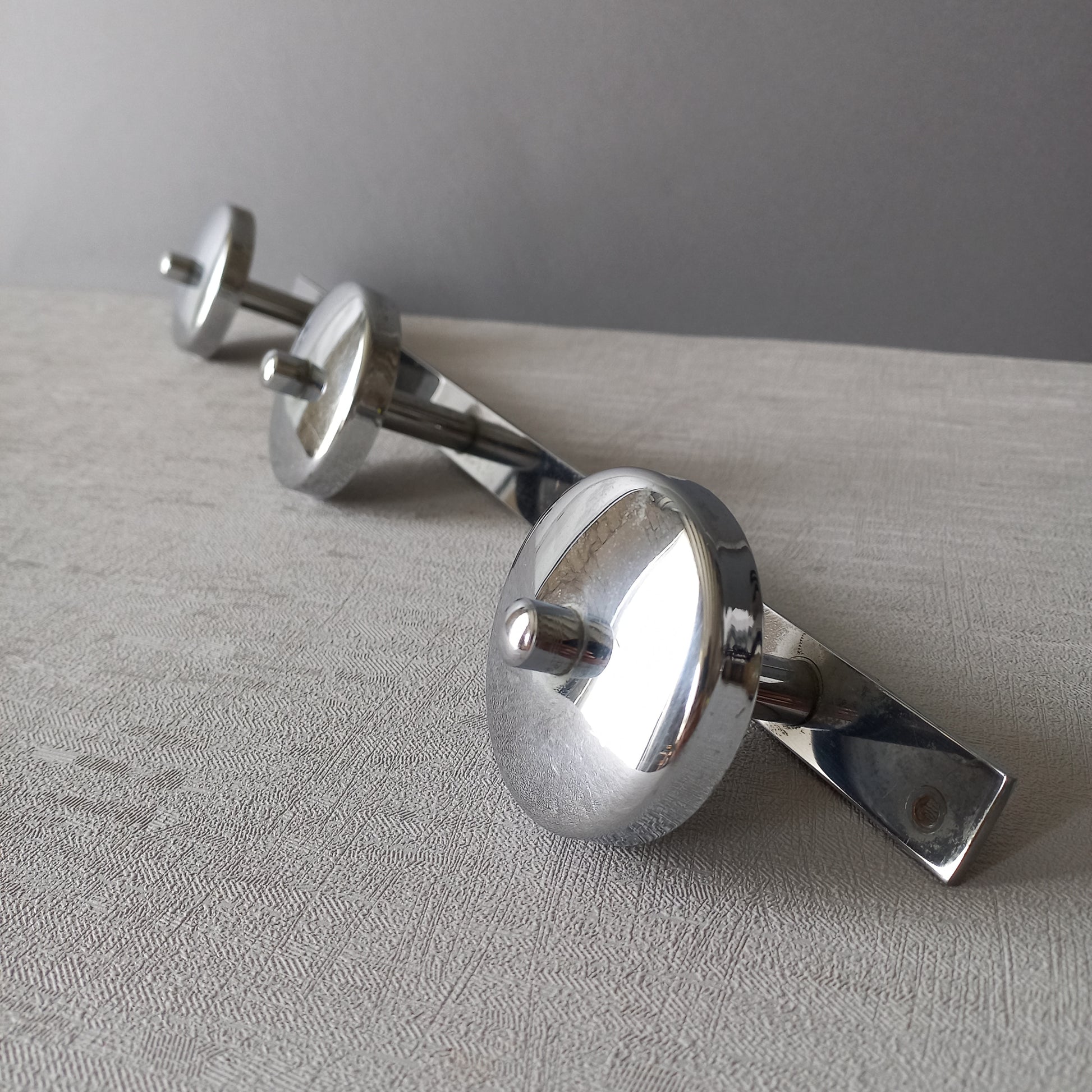 A stylish 3 peg modernist chromed metal coat rack, a great piece of practical wall decor.