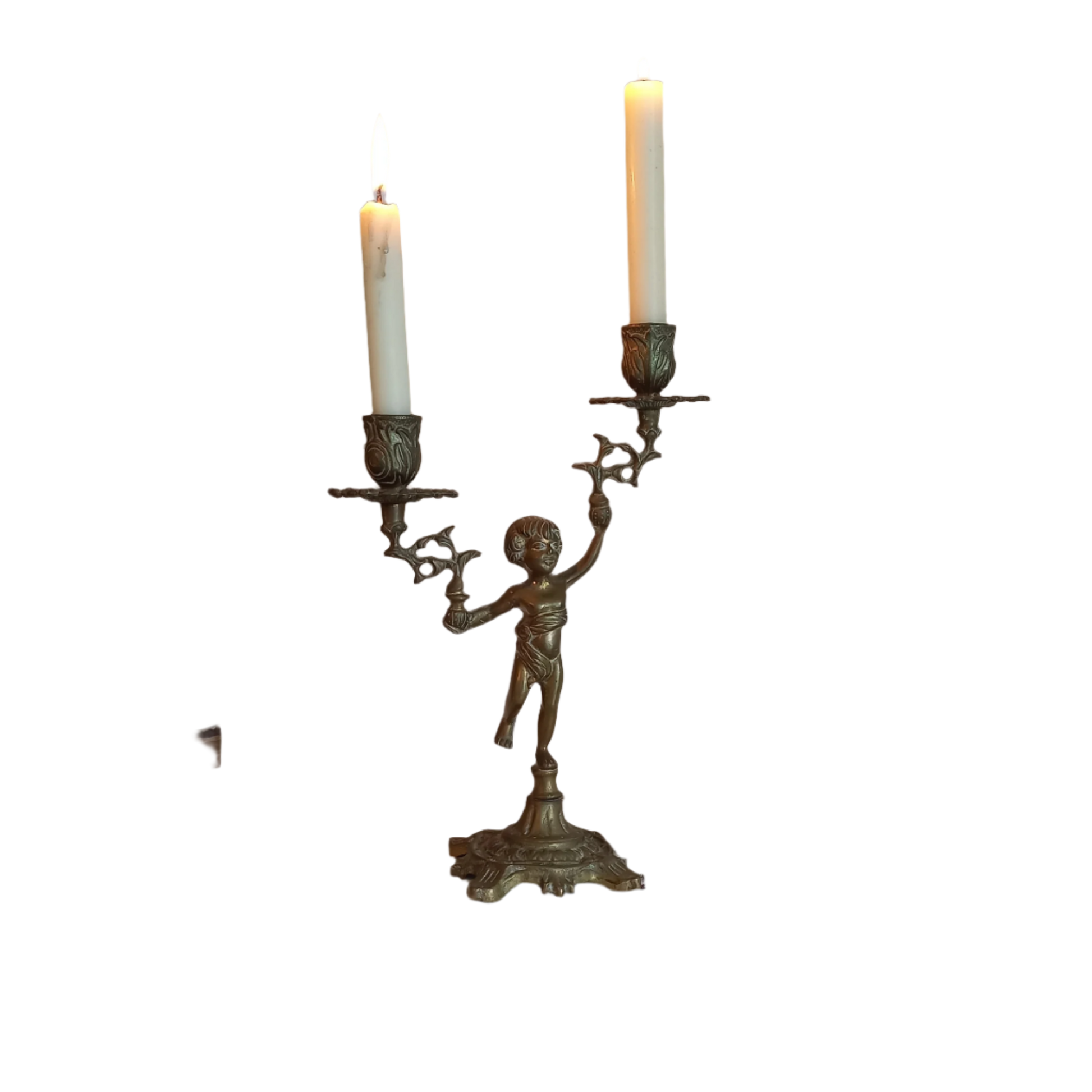 A French vintage brass cherub candle holder that will hold two candles. This heavy decorative piece will make eye-catching decor in any interior. Please see dimensions and condition details listed below.