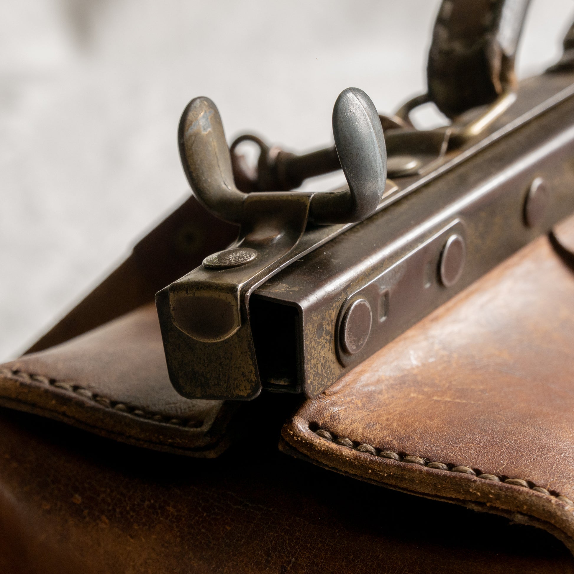 A French vintage leather shoulder/hand bag that's both practical and perfect as a prop or decorative piece in your interior, a beautifully aged piece with just enough patina of age to give it that authentic character. We have polished the distressed leather and thoroughly cleaned the bag both inside and out.