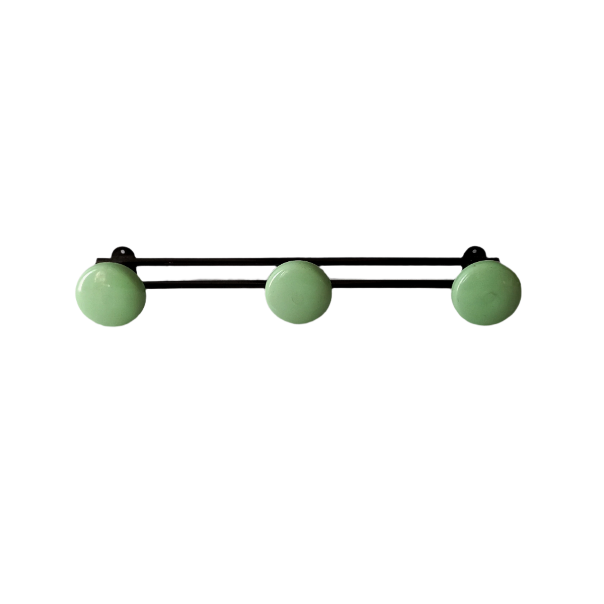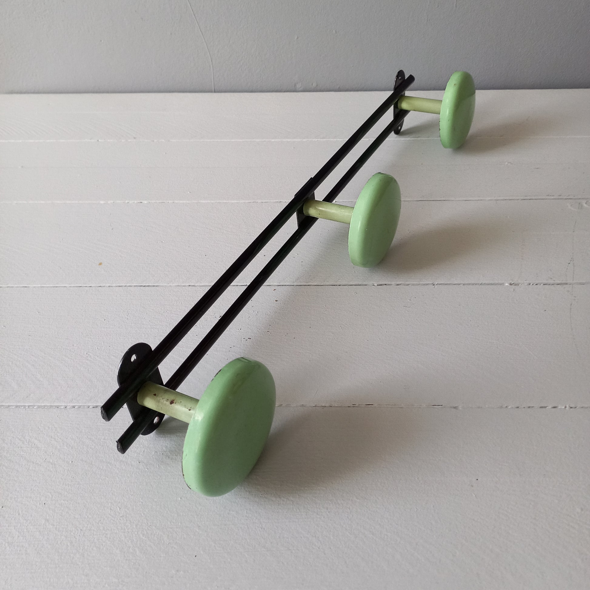 A super French vintage black metal coat rack with 3 round mint green/blue pegs - a wonderful piece of practical retro wall decor. Please see dimensions and condition details listed below.