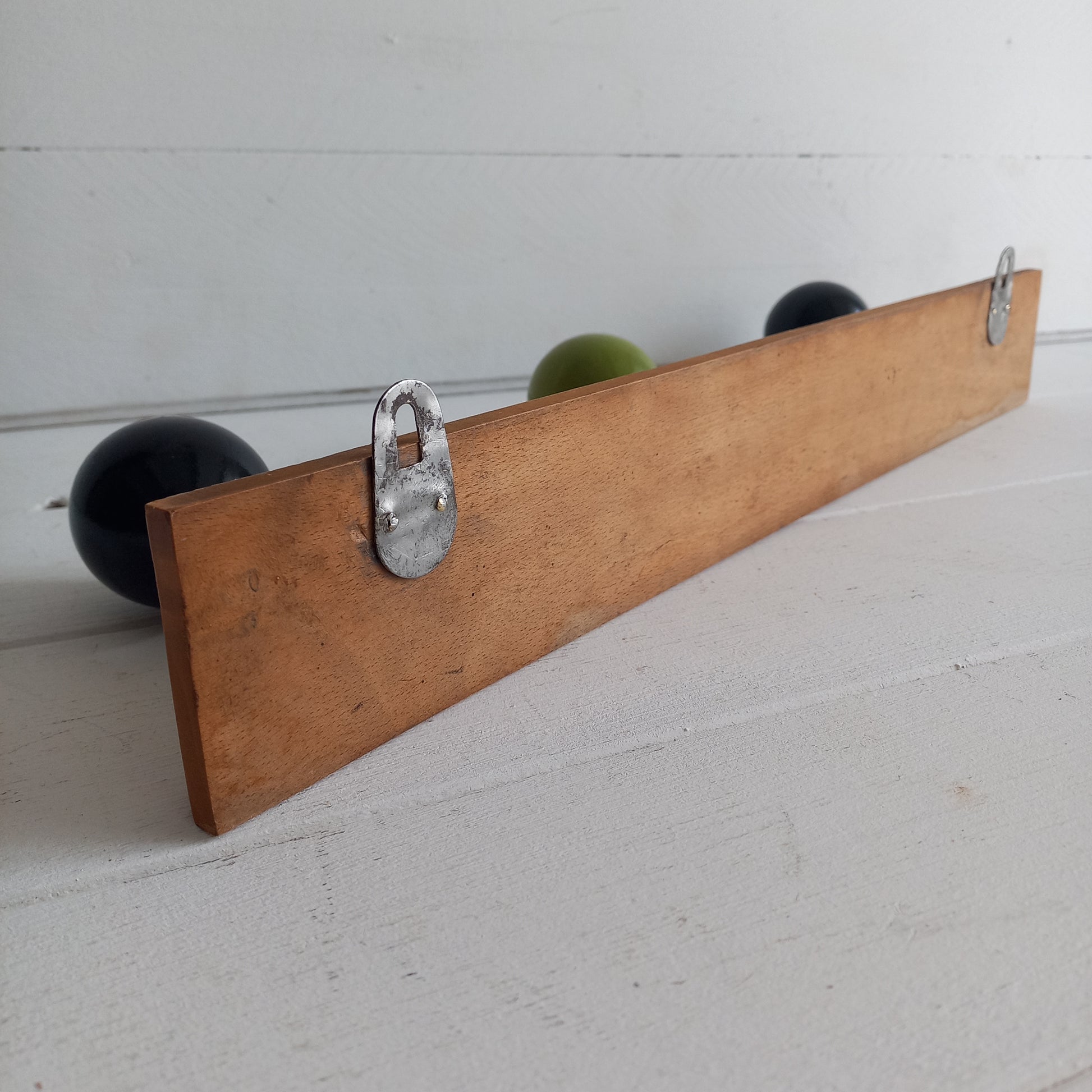 Vintage wooden coat rack with green and black pegs from France, retro wall mounted coat hanger