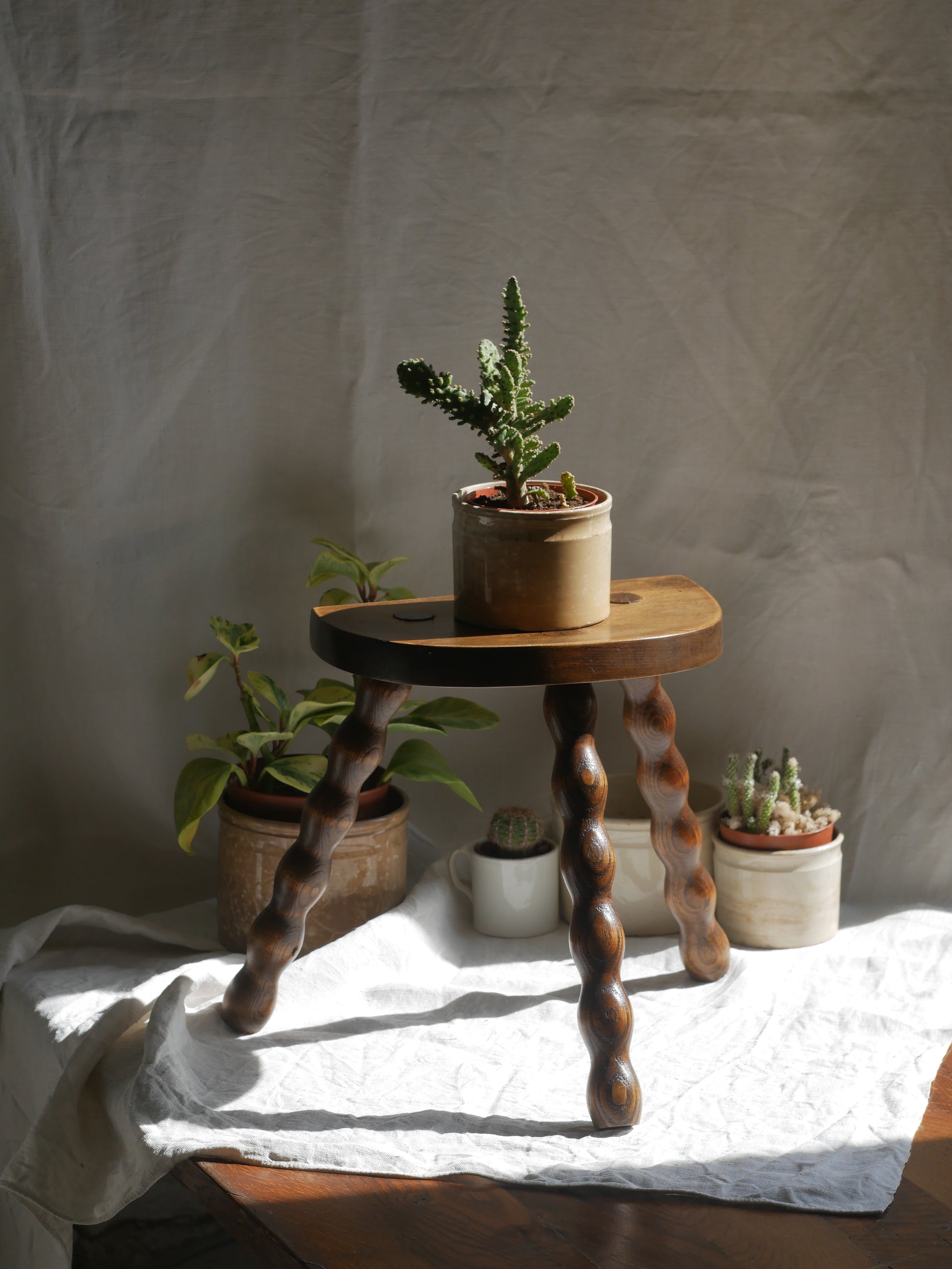 A small French vintage wooden stool, a strong and sturdy piece with nicely turned wooden legs. This old stool will look great in a house or an apartment and also serves well as a plant stand!